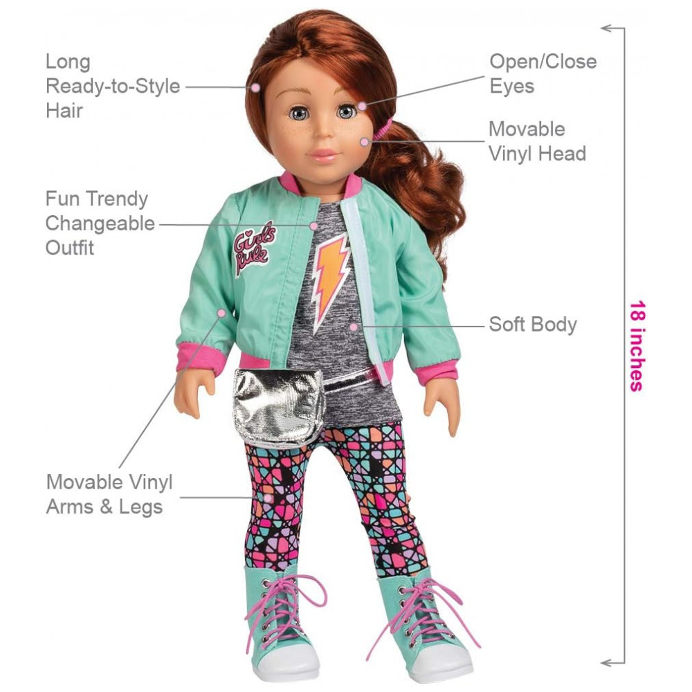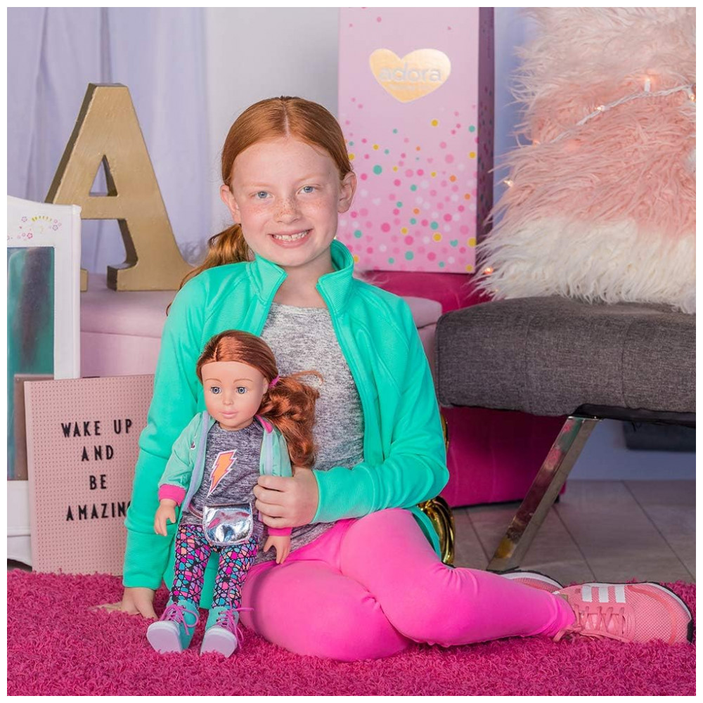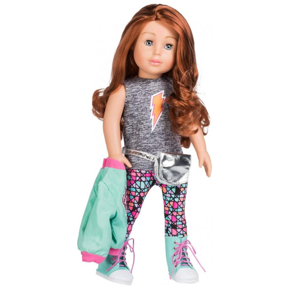 Um melhor amigo para cada criança ADORÁVEL BONECA DE com olhos cinza abertos, fechados e cabelo ruivo, e usa uma regata cinza com um raio, leggings descoladas com estampa de lycra, jaqueta bomber verde menta e rosa, laço de cabelo rosa e pochete prata metálica.
