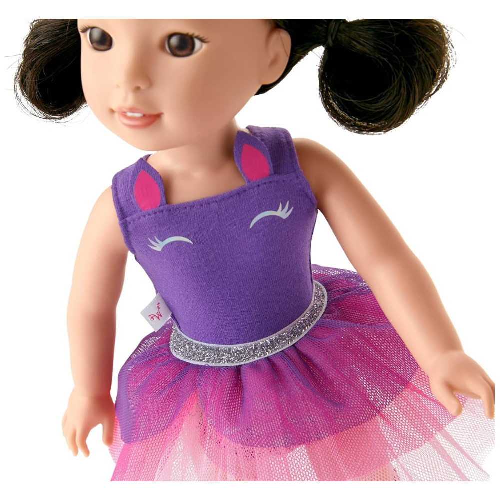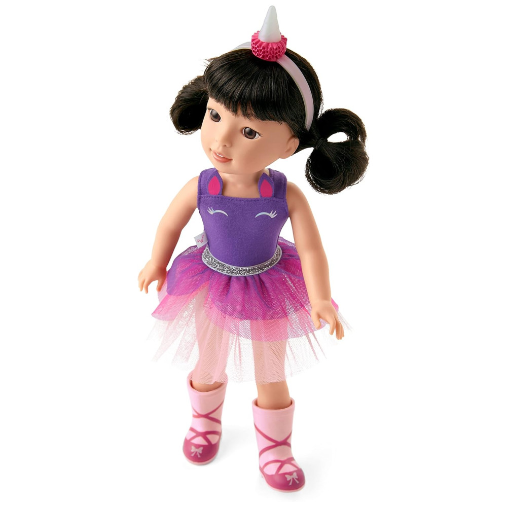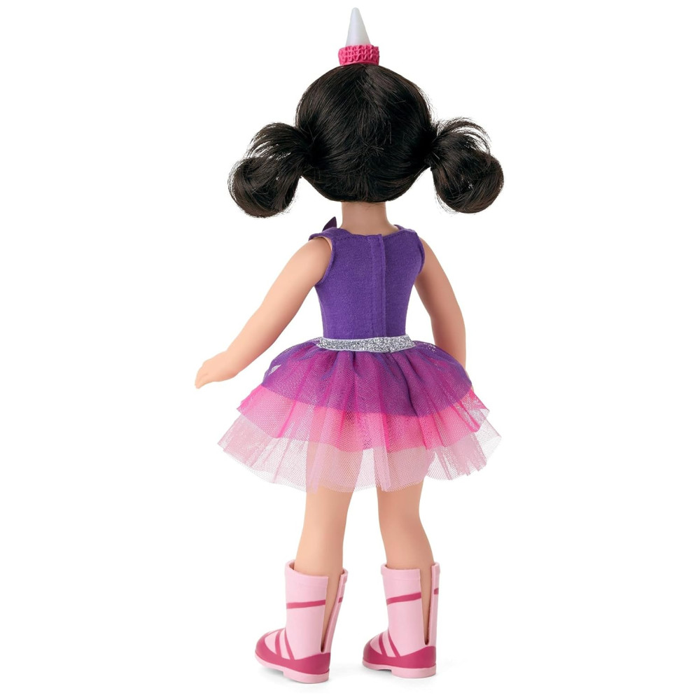 Uma boneca Emerson de com o tamanho certo para meninas mais novas. Ela tem olhos castanhos escuros e cabelos pretos em tranças encaracoladas.