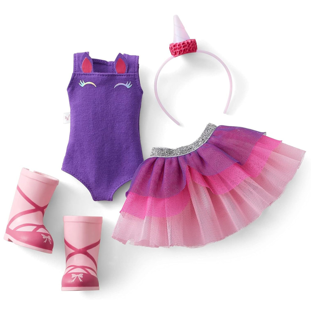 Um lindo collant roxo com um rosto de unicórnio prateado e orelhas de tecido.