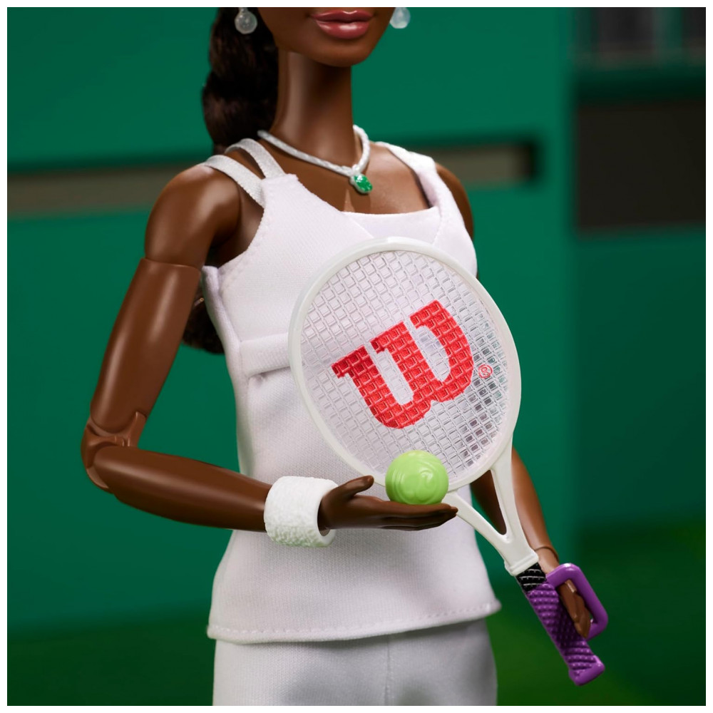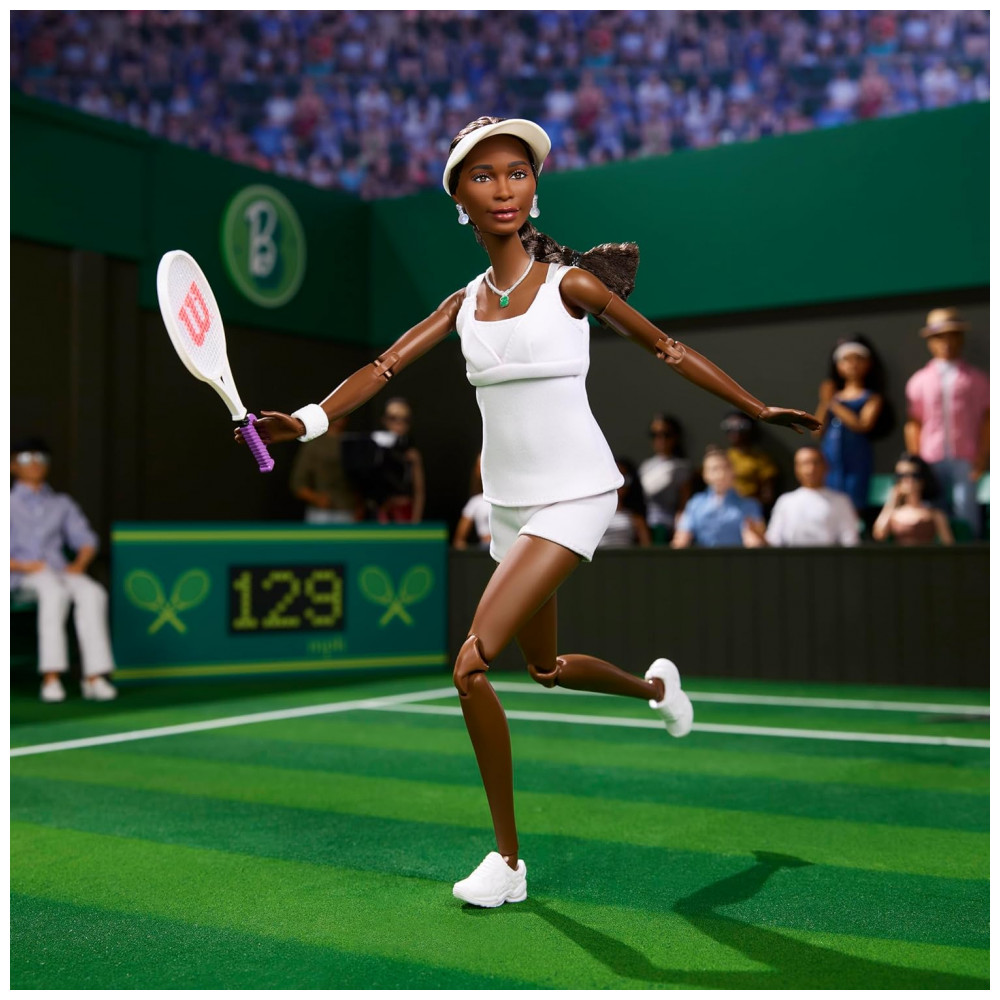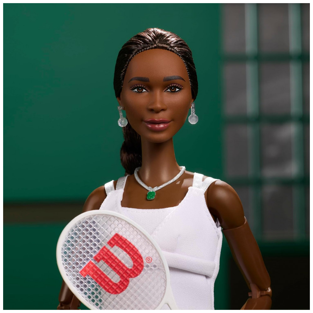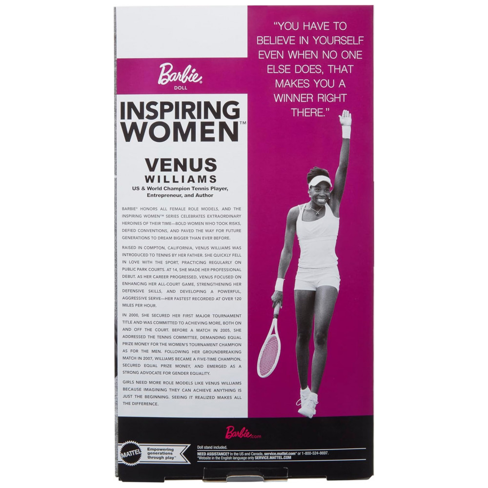 A boneca Barbie Inspiring Women Venus Williams homenageia a tenista campeã mundial e sua atuação em defesa da igualdade de premiação entre mulheres e homens no tênis. A boneca veste uniforme de tênis inspirado em seu visual de quadra, composto por top, shorts, viseira e tênis esportivos. Como referência ao torneio de 2007, ela usa um colar com pedra verde, reproduzindo o acessório real da atleta.