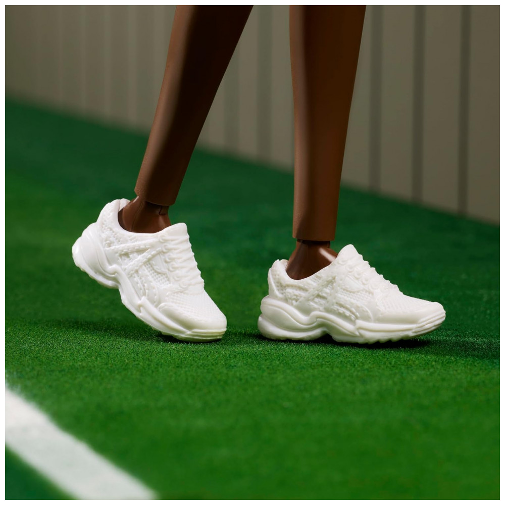 O conjunto inclui uma raquete de tênis para compor poses de jogo e exibição. A embalagem é desenhada para exposição, permitindo que a boneca seja exibida em caixa, voltada tanto para colecionadores quanto para crianças a partir de 6 anos.
