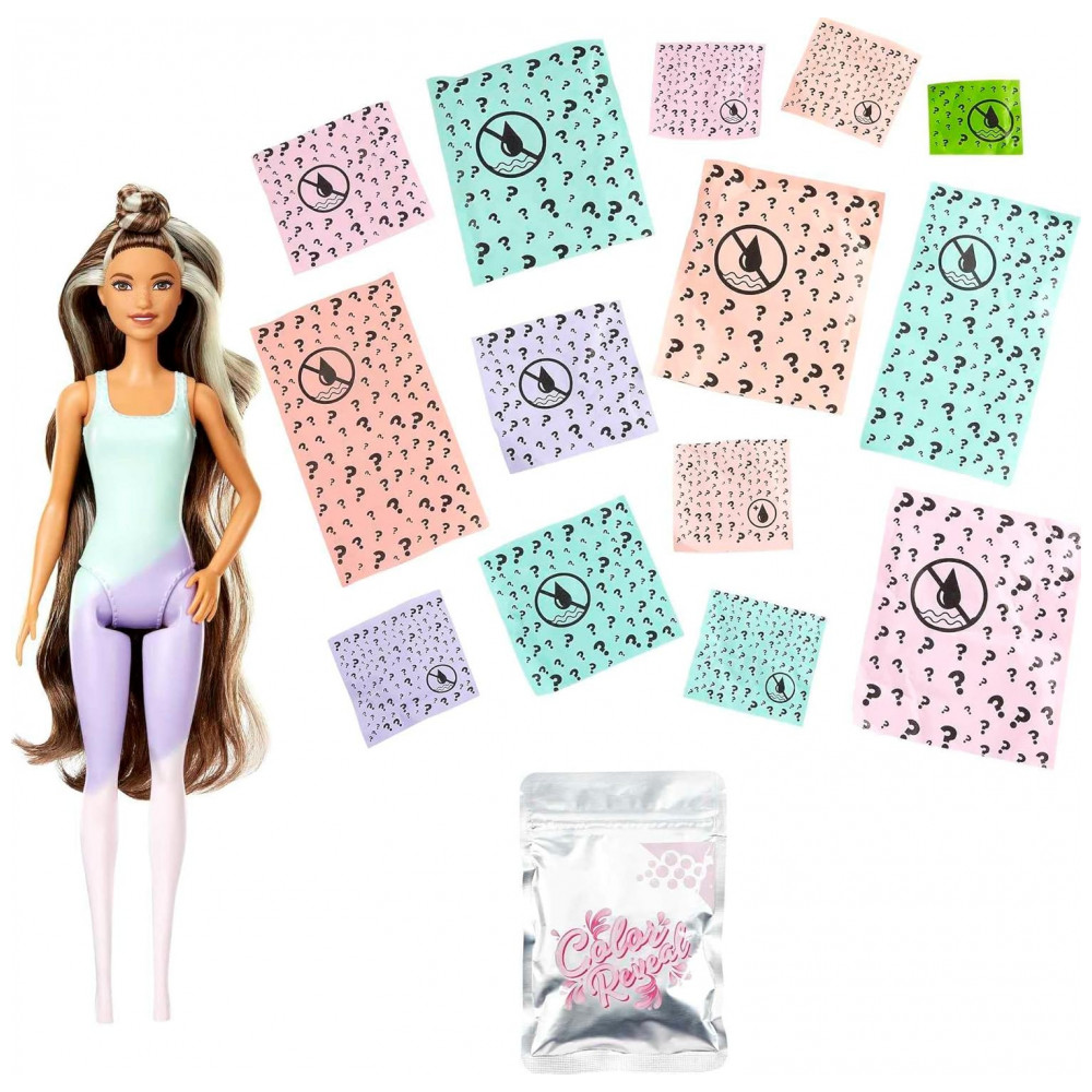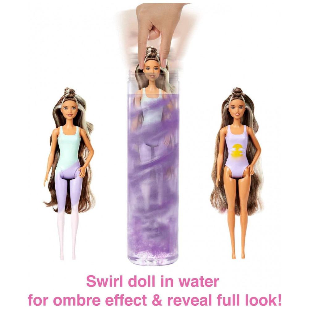 Abra o tubo e retire uma boneca Barbie cujo visual é coberto por um revestimento ombre pastel Color Reveal continue desembalando para encontrar um cachorrinho mole