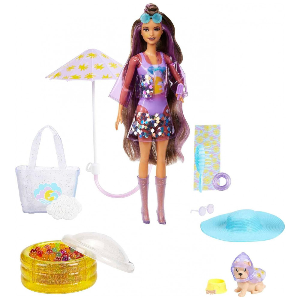 Com 25 surpresas em um pacote, os conjuntos de bonecas Barbie Color Reveal Sunshine e Sprinkles oferecem a melhor experiência de unboxing com ombre Color Reveal Innovation, um guarda chuva com recursos de água e moda para se divertir faça chuva ou faça sol