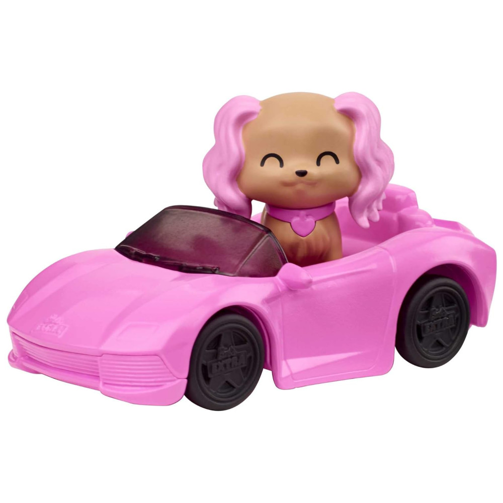 Seu filhote de estimação também é tão EXTRA, com orelhas cor de rosa, uma gola rosa e seu próprio carro conversível rosa
