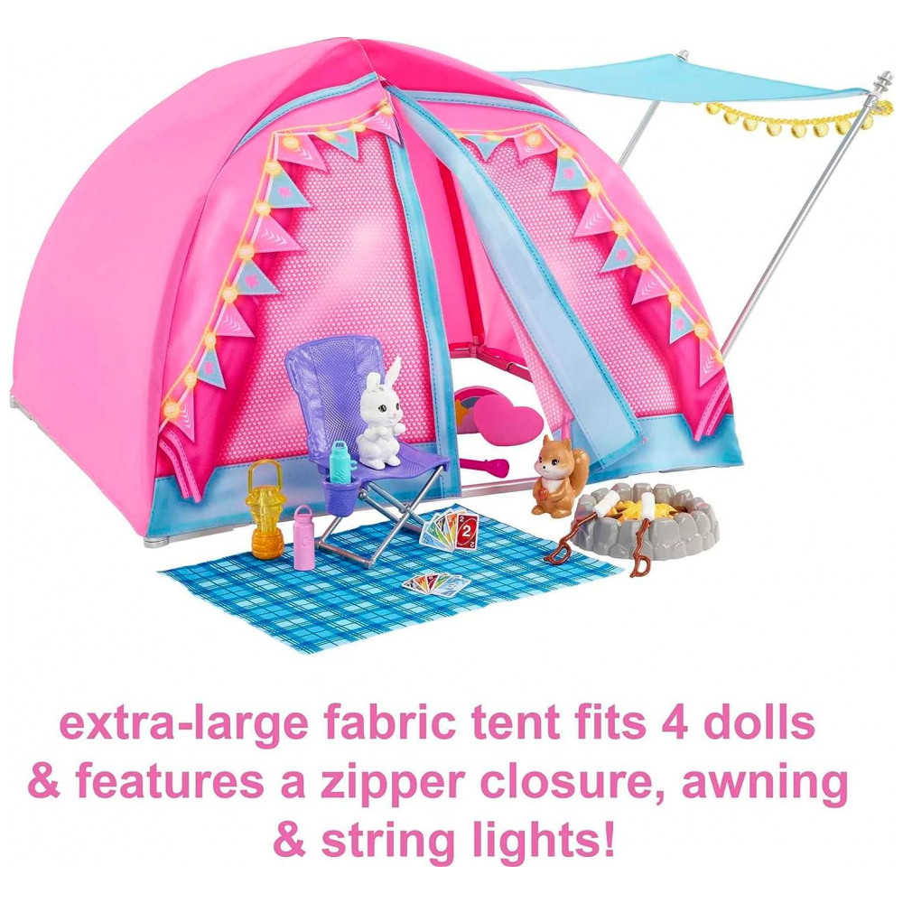 Inclui 2 bonecas Barbie com roupas e sapatos, 1 barraca com toldo, 1 cordão de luzes, 2 figuras de animais, 2 cadeiras, 1 cobertor, 1 telescópio, 1 fogueira, 2 mãos de cartas, 2 garrafas de água, 1 lanterna, 1 lancheira, 2 torradores de marshmallow e 2 almofadas.