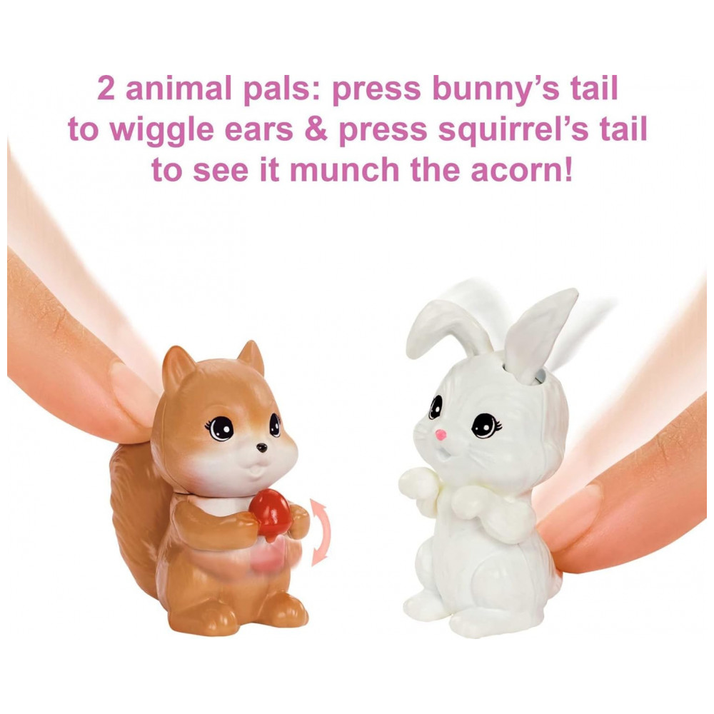 Diga olá para 2 amigos animais pressione o rabo do coelho para ver suas orelhas mexerem e pressione o rabo do esquilo para vê lo mastigar uma bolota.