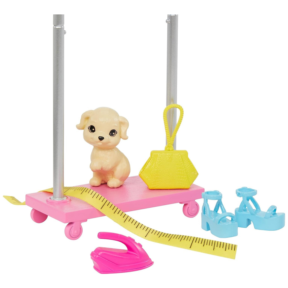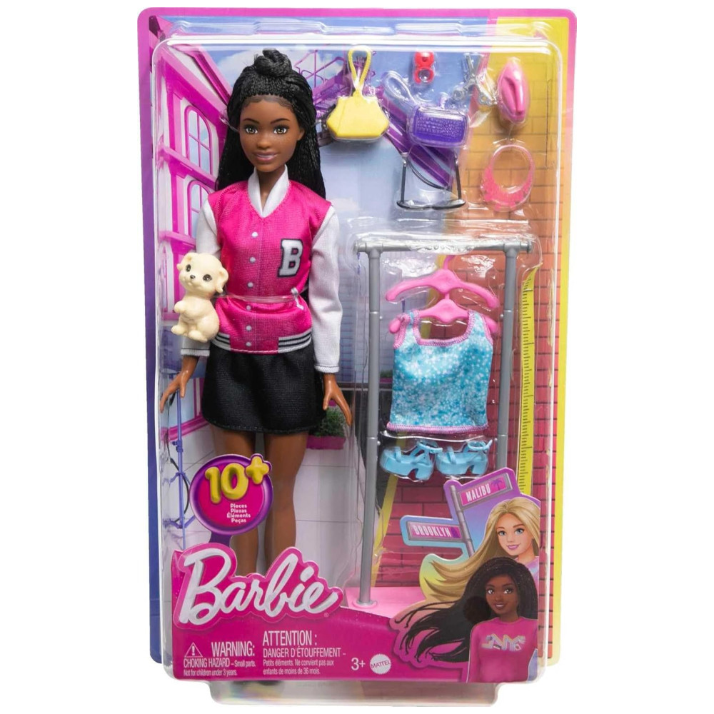 A boneca Barbie Brooklyn está cuidando do guarda roupa com 14 peças temáticas que incluem um cachorrinho, cabideiro e itens para contar histórias como top, sapatos, 2 bolsas e fita métrica