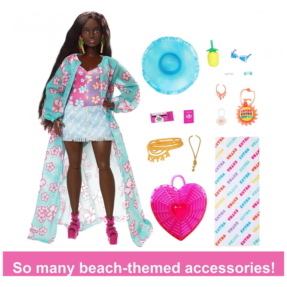 É tudo sobre os detalhes EXTRA A boneca Barbie vem com 15 acessórios como uma bebida tropical, um chapéu de praia enorme, brincos de palmeira e óculos de sol para inspirar a auto expressão e o estilo divertido.