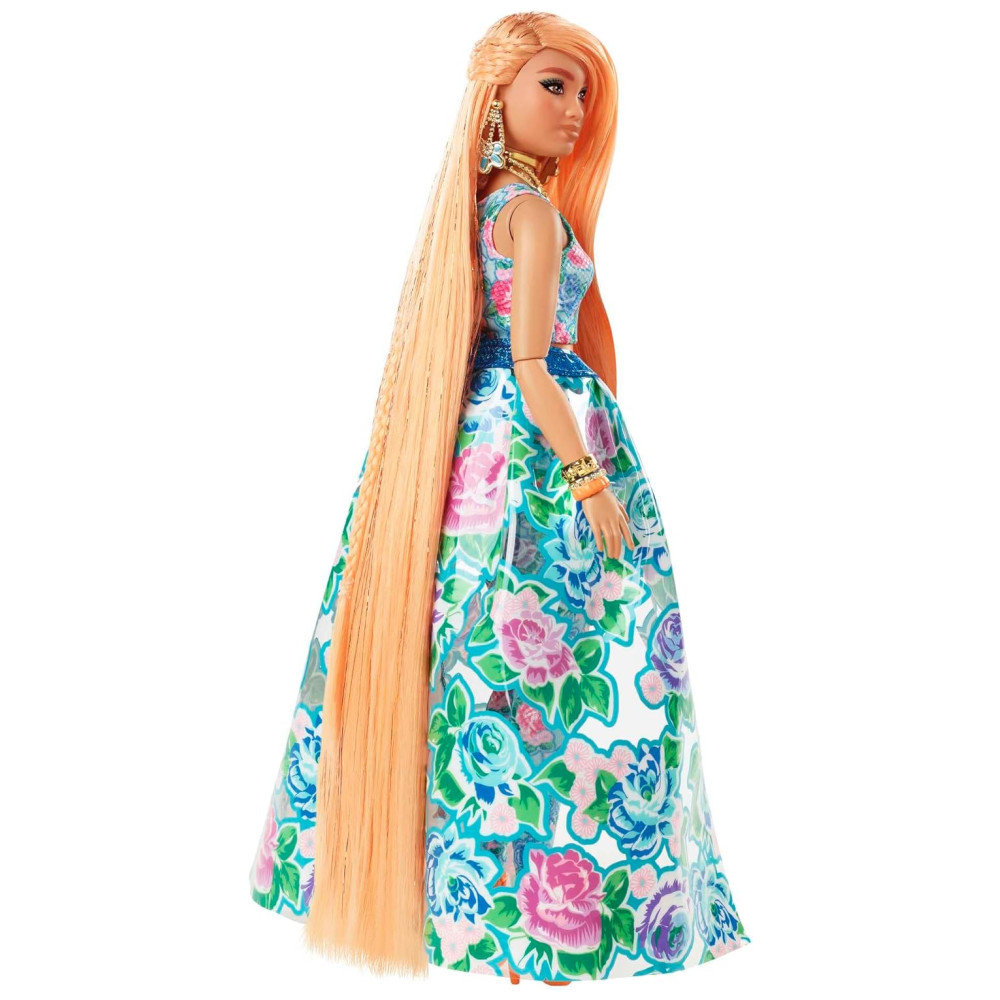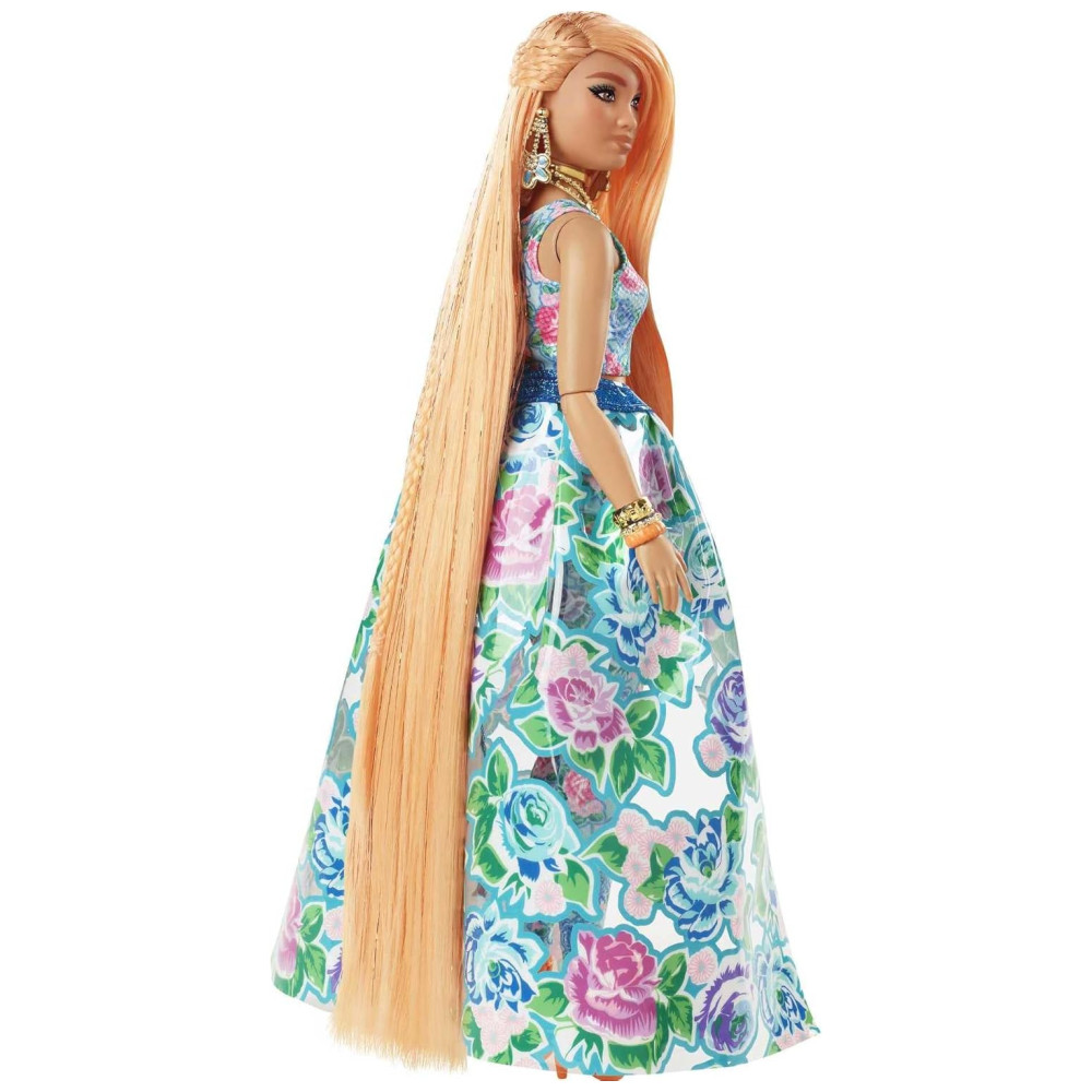 O visual da boneca Barbie fica grande com cabelos extra longos e alaranjados, com destaques brilhantes e detalhes trançados.