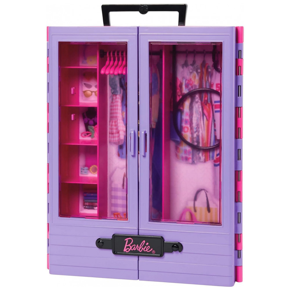 O armário tem um exterior roxo com um interior rosa e está decorado com portas duplas claras para um vislumbre do guarda roupa da boneca Barbie