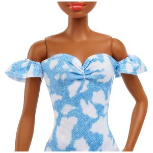 A boneca Barbie tem uma forma do corpo e usa um vestido jeans descolorido, combinado com botas brancas fofas.