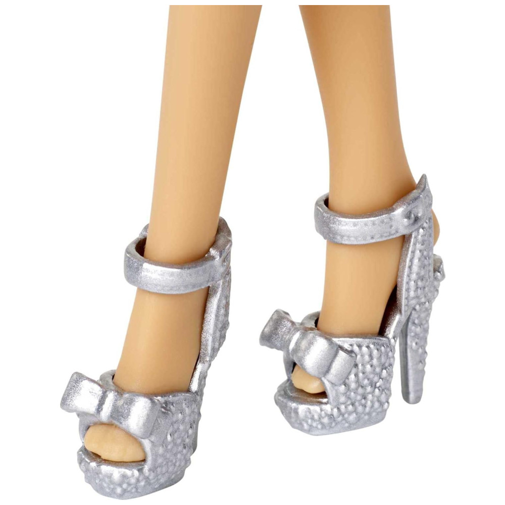 A boneca Barbie vem com um lindo presente prateado que combina com seu vestido com um laço rosa