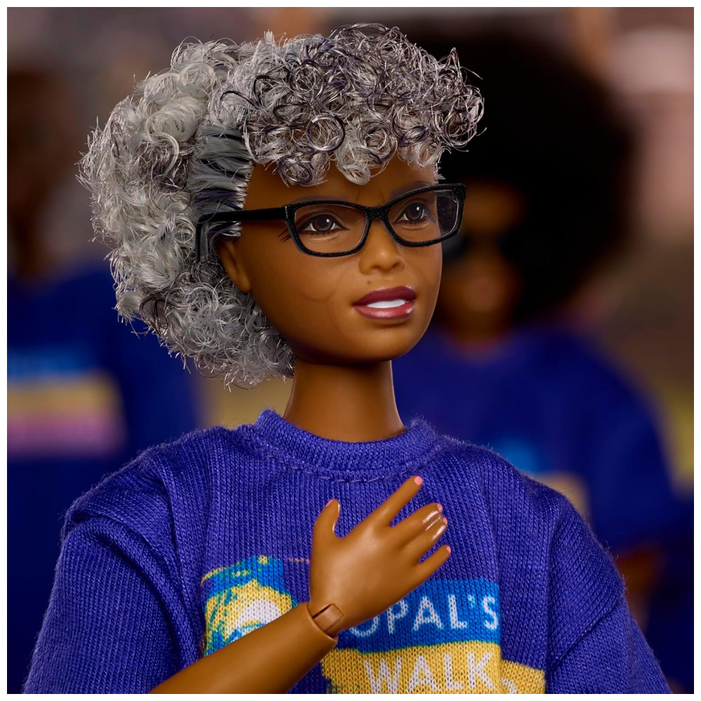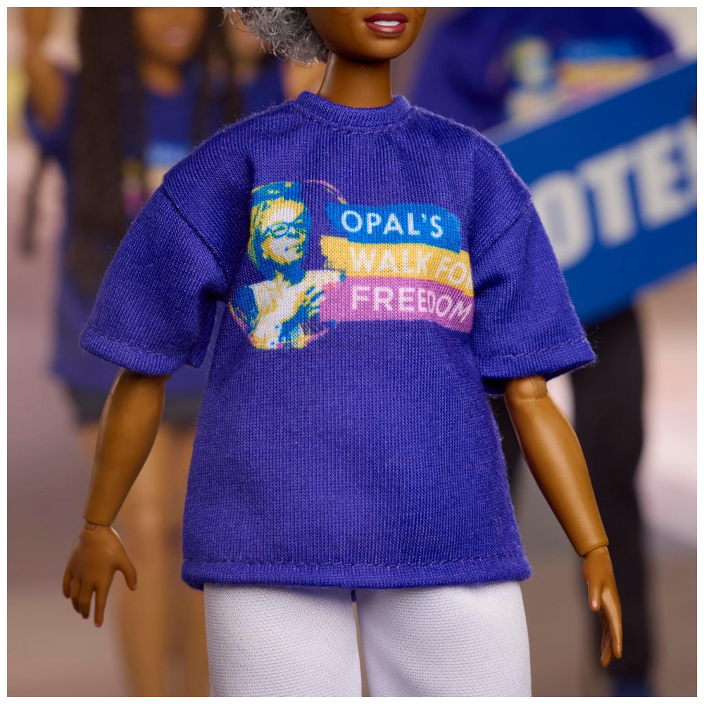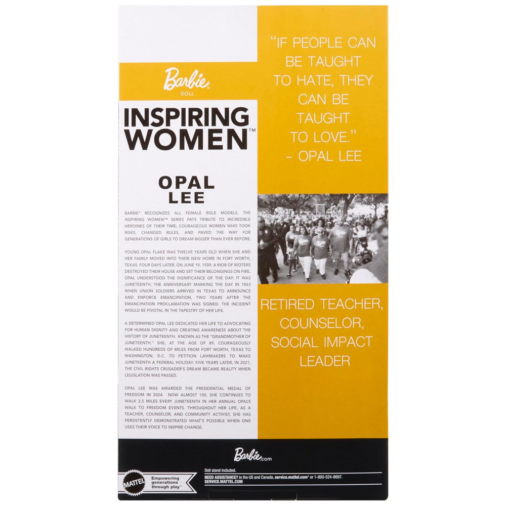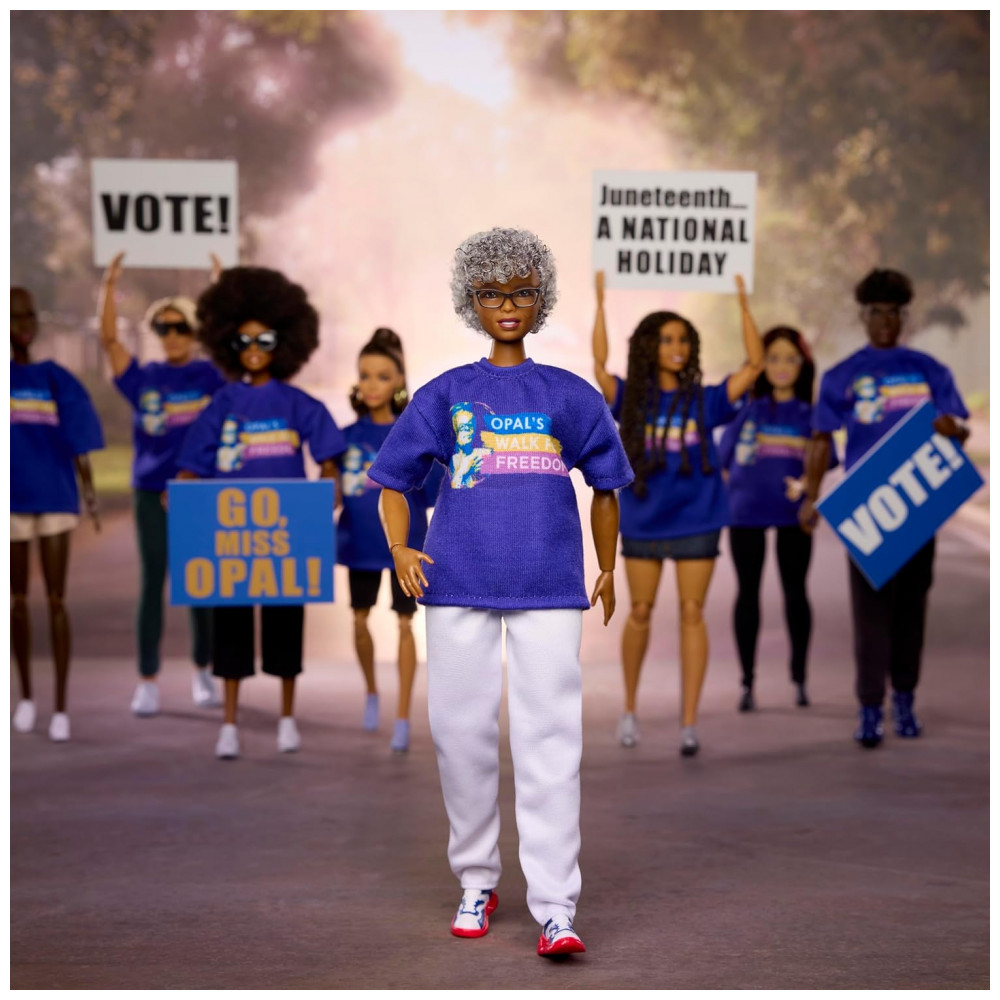 A boneca Barbie Inspiring Women Opal Lee homenageia a “avó do Juneteenth”, educadora, conselheira e ativista comunitária dedicada à luta por mudanças positivas. Aos 89 anos, Opal Lee caminhou centenas de quilômetros até Washington, D.C. para pedir que o Juneteenth se tornasse feriado nacional, conquista alcançada em 2021. Todos os anos, ela promove uma caminhada de 2,5 milhas para lembrar os 2,5 anos que a notícia e a aplicação da Proclamação de Emancipação demoraram para chegar às pessoas escravizadas no Texas.