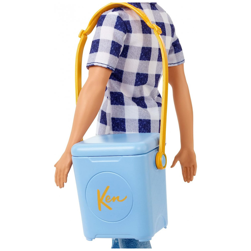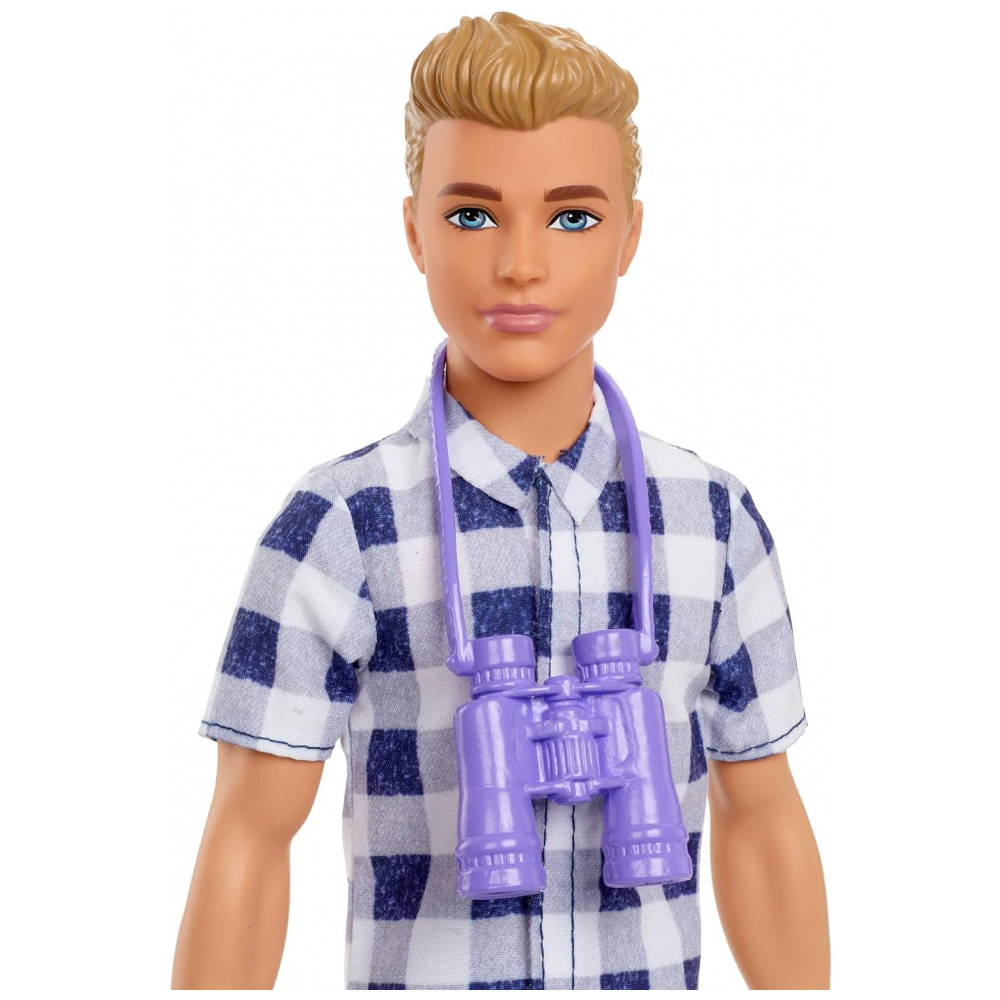 Inclui boneco Ken vestindo camisa, jeans e sapatos, 1 par de óculos de sol, 1 par de binóculos, 1 mapa, 1 lancheira, 1 garrafa de água e 1 refrigerador