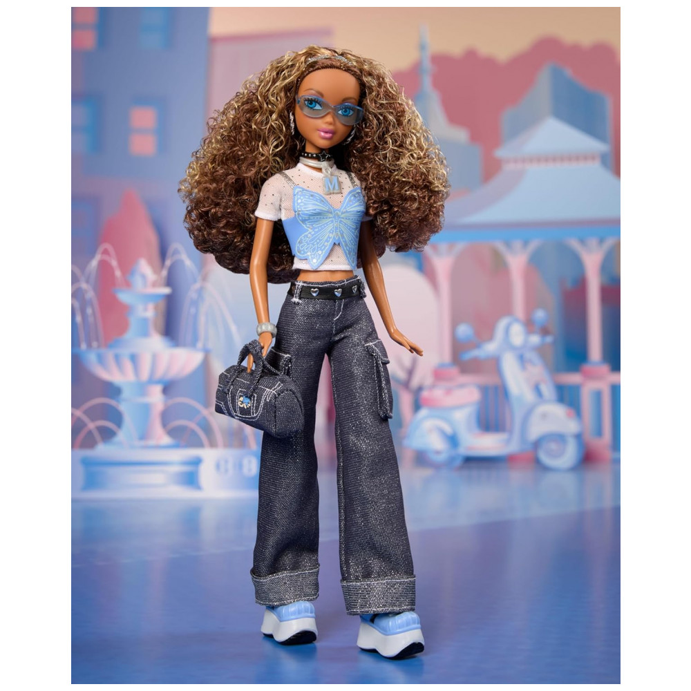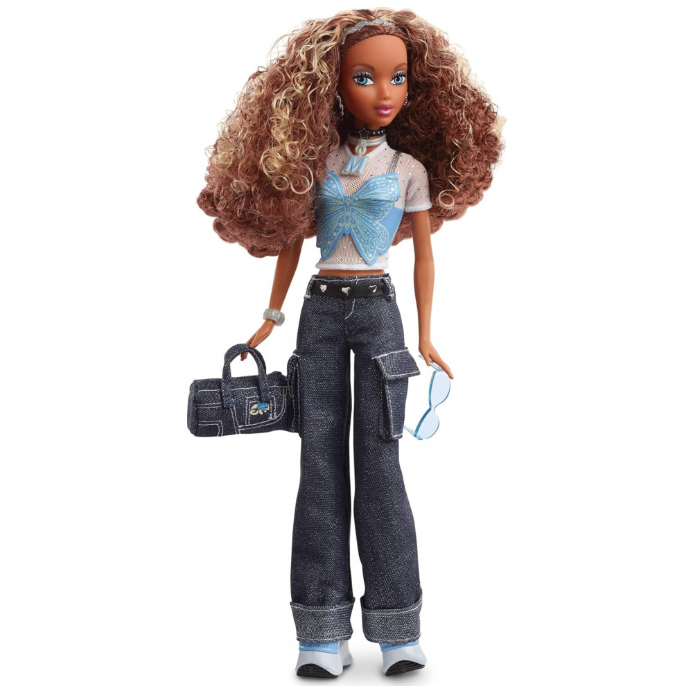 A boneca Barbie My Scene Madison Signature traz a personagem Madison em edição de colecionador com visual urbano inspirado na moda Y2K. O conjunto de roupas inclui top cropped azul claro com estampa de borboleta, camiseta de malha brilhante por baixo e calça jeans cargo de modelagem ampla. Os acessórios combinam óculos azul claro, cinto, bolsa jeans e tênis plataforma, compondo um look de rua típico dos anos 2000.