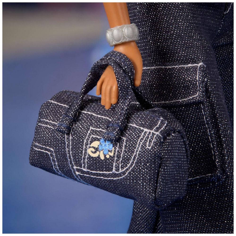 Acessórios inclusos: Óculos azul claro, cinto, bolsa jeans, tênis plataforma, suporte para boneca, Certificado de Autenticidade