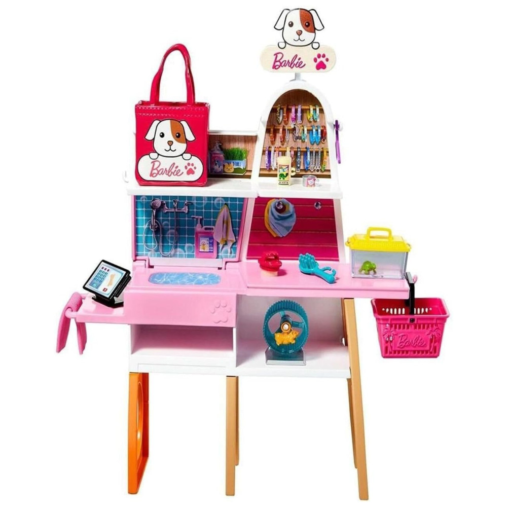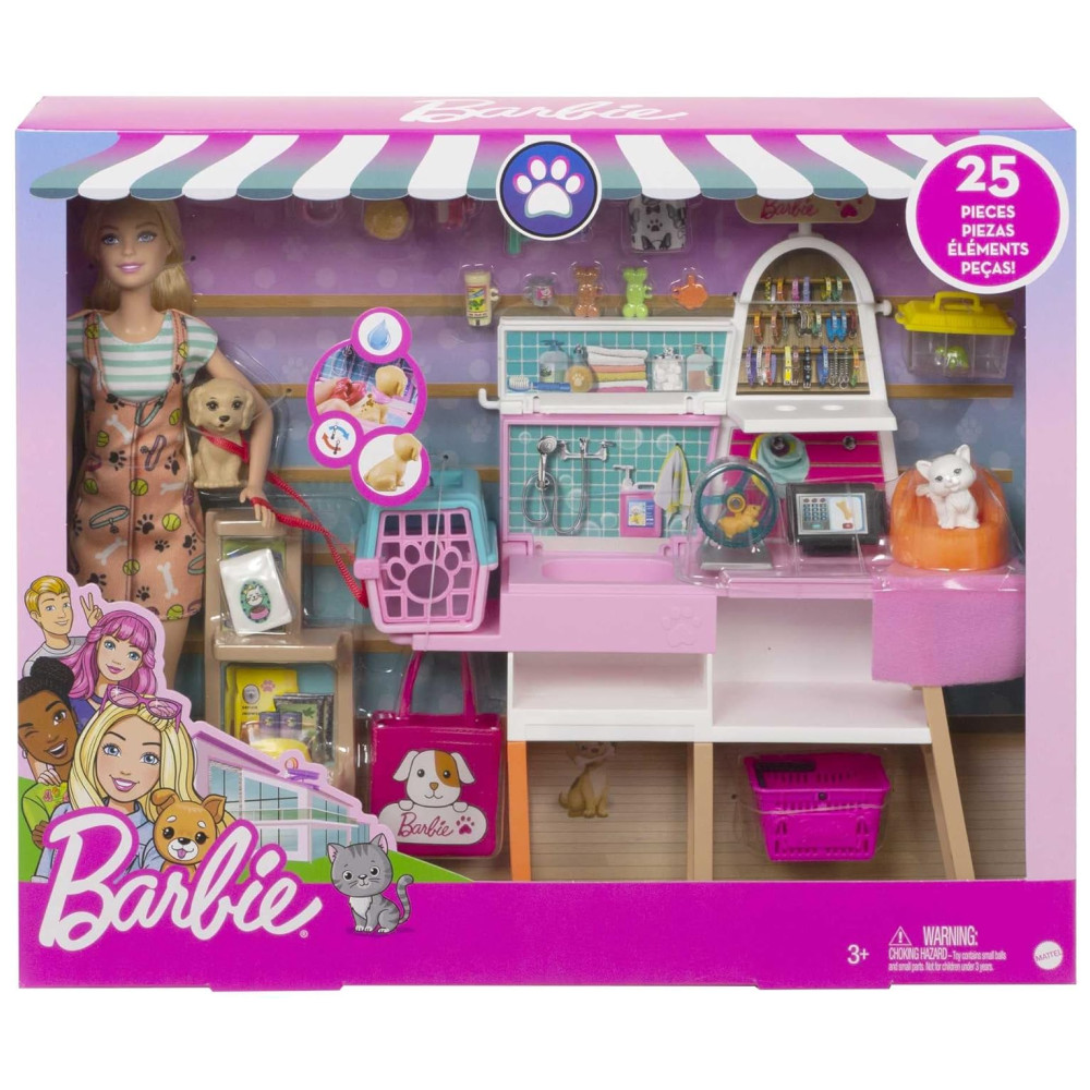 O playset boutique de animais de estimação da Barbie é o sonho de qualquer amante de animais com 4 animais de estimação, uma estação de cuidados, balcão de check out e mais de 20 peças temáticas.