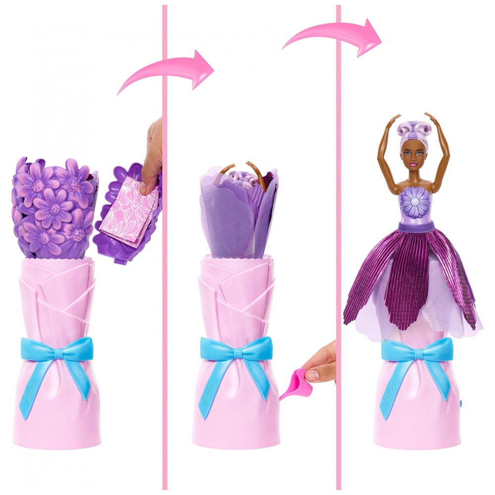 Conteúdo da embalagem: 1 boneca Barbie Petal Pop Daisy, 1 vaso/buquê, 1 pet coelho, 1 regador, 1 colar, 1 par de brincos, pétalas e saquinhos surpresa com acessórios