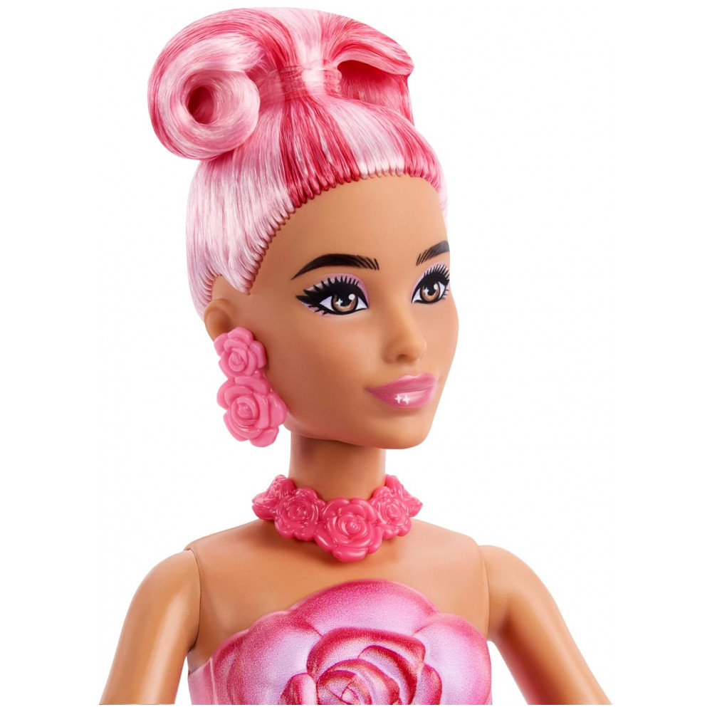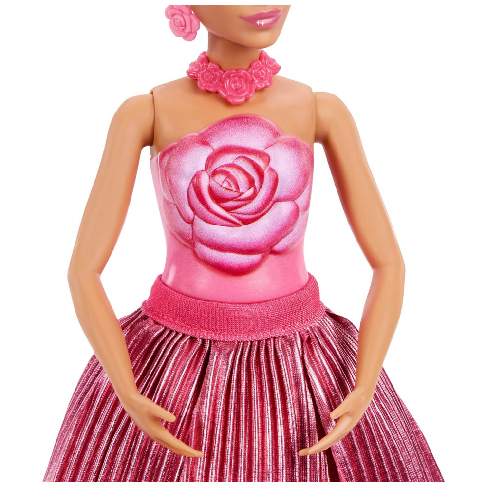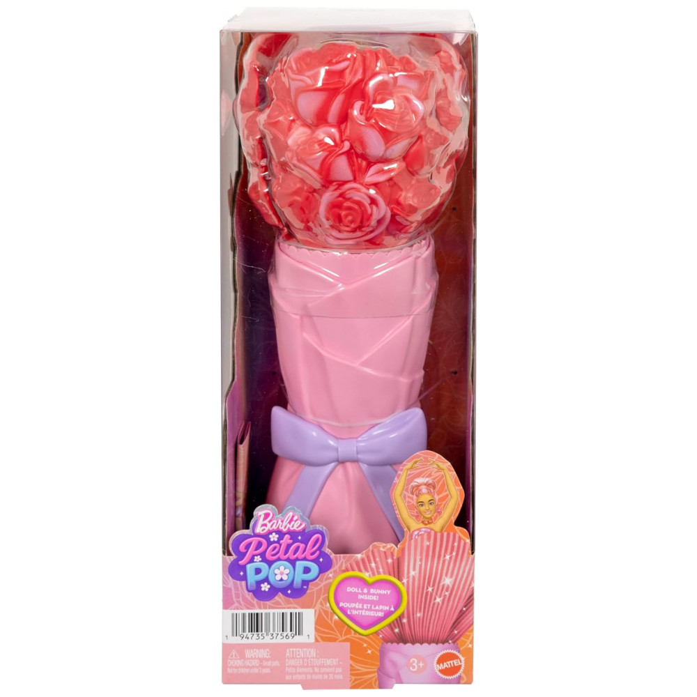 A boneca Barbie Petal Pop Rose traz uma experiência de brincadeira com temática floral, combinando fragrância, surpresa de revelação e acessório de animal de estimação. A personagem vem acomodada dentro de um buquê de flores em formato de vaso, com mecanismo que permite que a boneca “desabroche” a partir da base. O modelo utiliza vestido com corpete em formato de flor e saia volumosa em camadas de pétalas rosa, com cores vibrantes e efeito de fantasia.