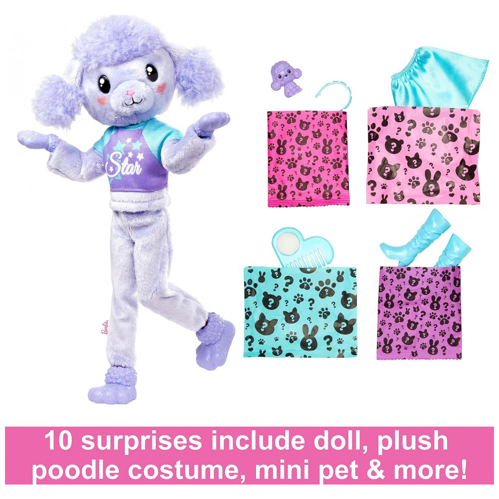 Abra a caixa para encontrar um adorável poodle roxo de pelúcia vestindo uma camiseta colorida com uma mensagem inspiradora Estrela e escondendo uma boneca Barbie dentro.
