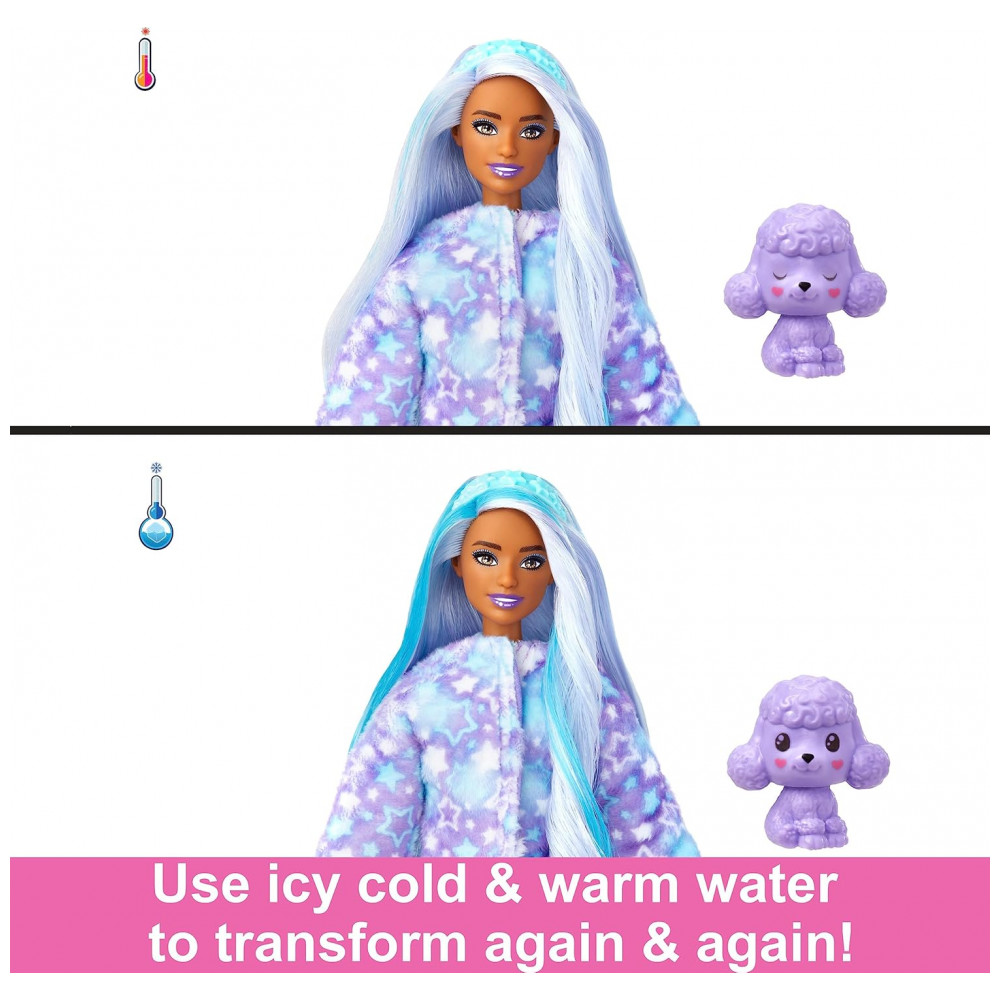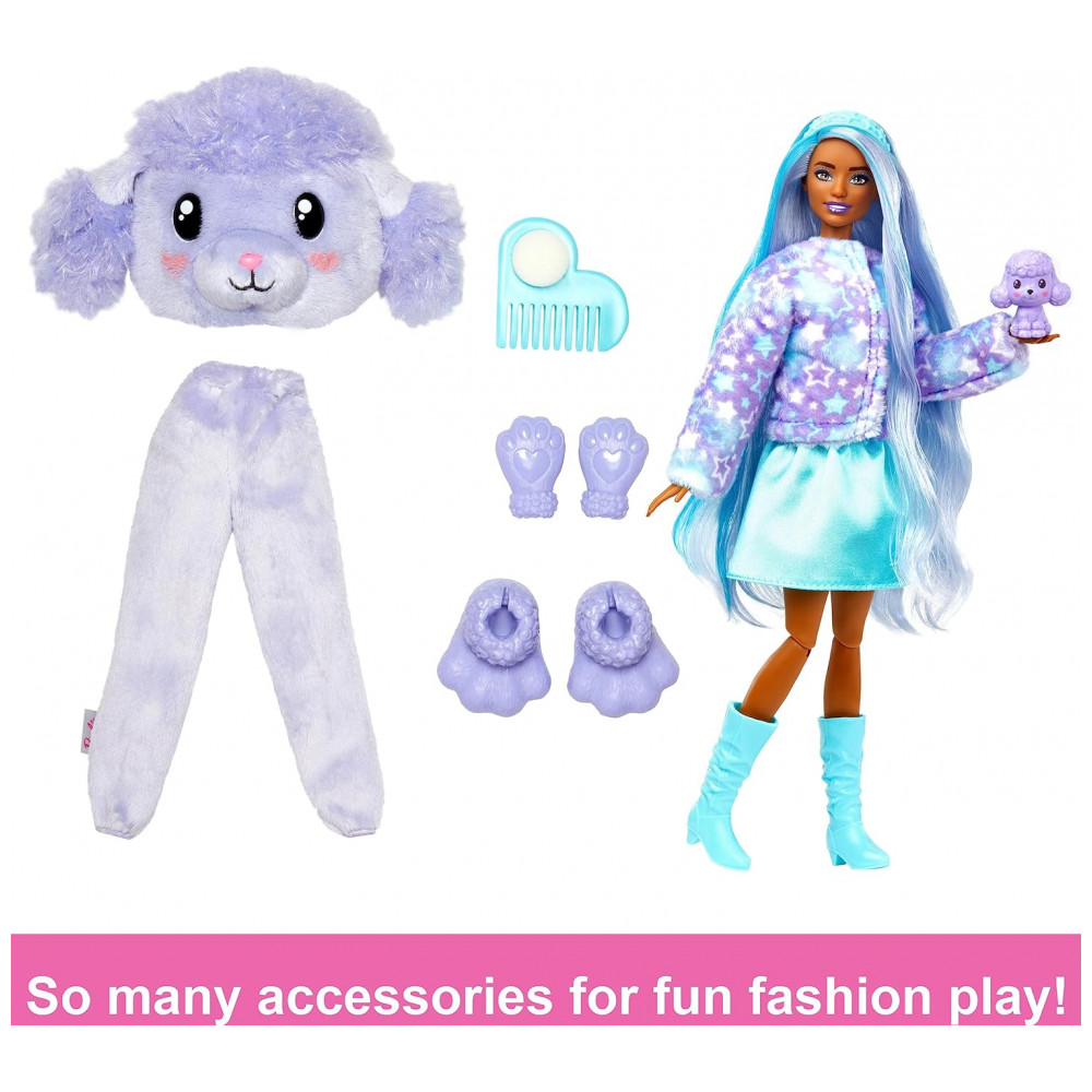 As crianças podem vestir e estilizar a Cutie Barbie invertendo a parte superior da fantasia para encontrar uma jaqueta de lã supermacia com uma estampa estrelada. A cabeça da fantasia também se transforma em uma cama para o mini amigo de estimação