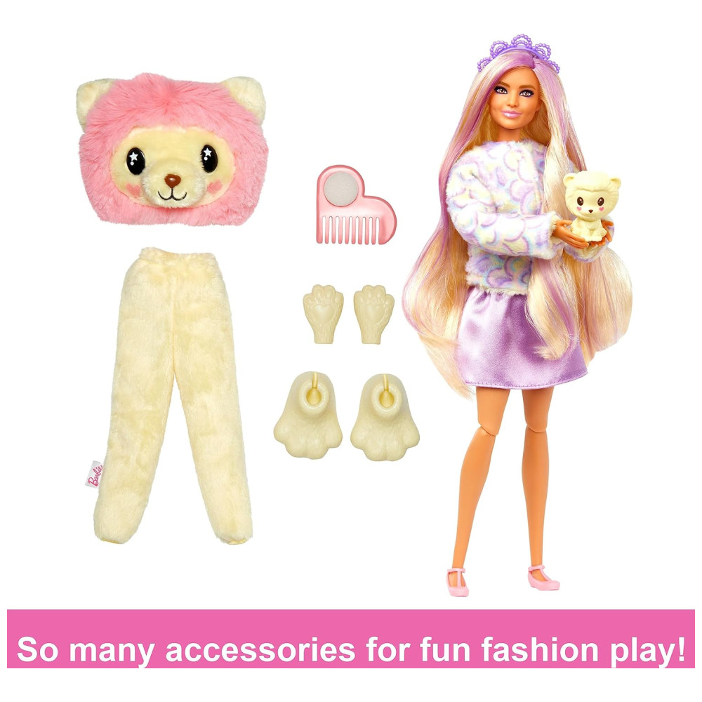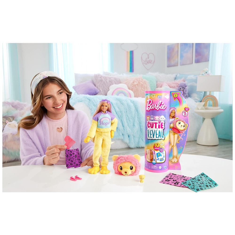 Inclui Barbie Cutie Reveal traje de uso de bonecas conjunto de 5 peças e 4 bolsas contendo mini animal de estimação, pentes de esponja, 1 par de sapatos e 1 saia. Boneca não pode ficar sozinha. Cores e decorações podem variar.
