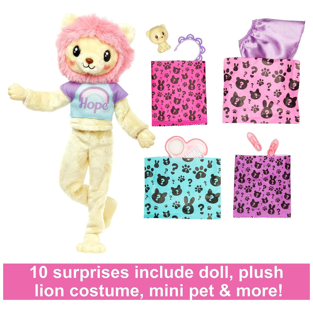 Unbox para encontrar um leão amarelo adorável e luxuoso em uma camiseta colorida com uma mensagem inspiradora de Hope e esconder uma boneca Barbie lá dentro