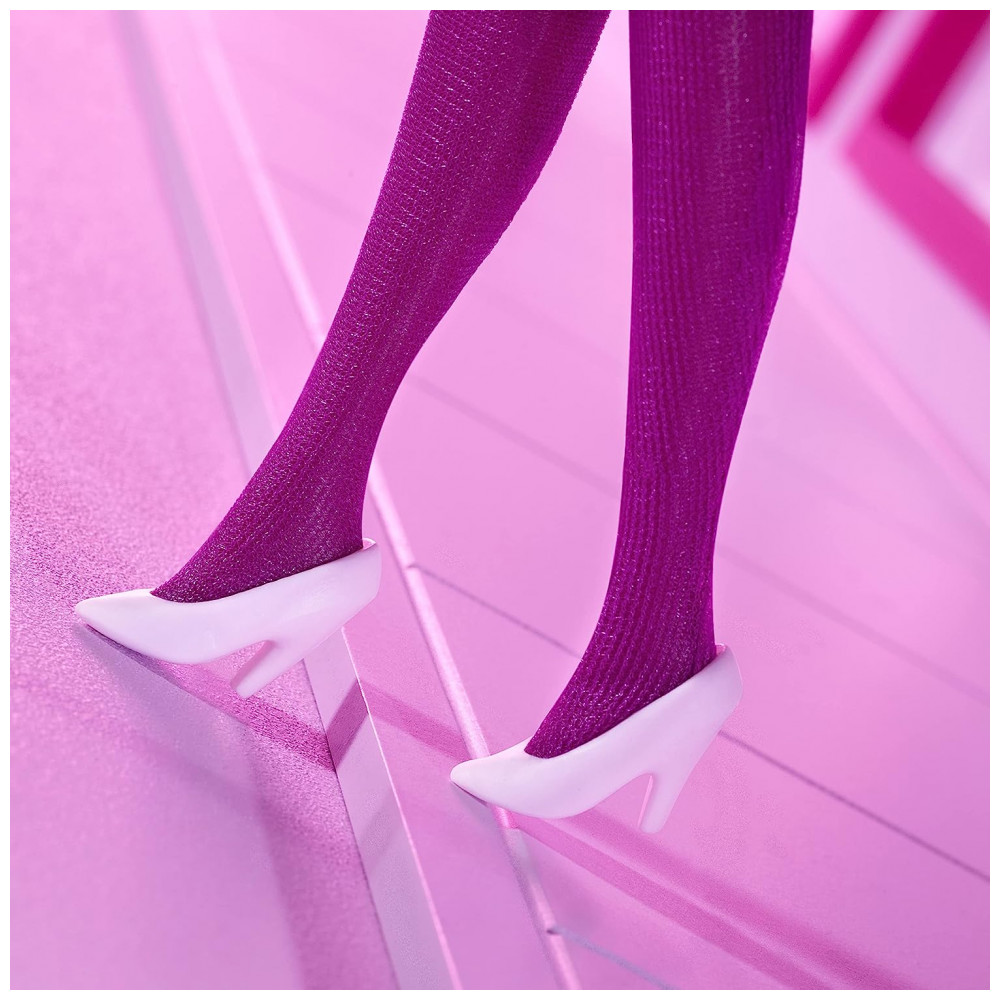 Esta boneca Barbie Rewind leva o estilo sofisticado ao máximo em um vestido fresco com grandes ombreiras, um cinto rosa e acessórios perolados.
