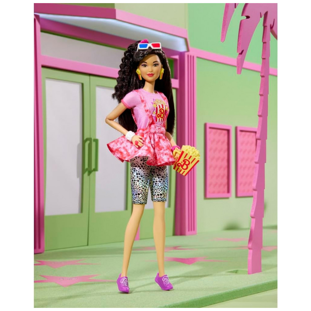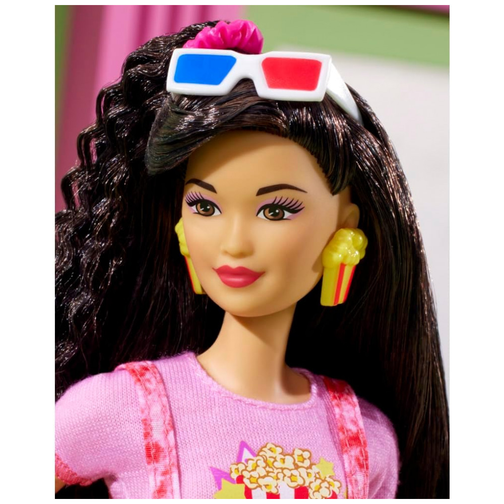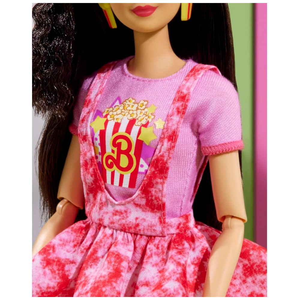 Estão incluídos todos os itens essenciais do filme: um balde de pipoca com um logotipo vintage da Barbie, Uma bolsa tiracolo de milk shake, raspadinha, pretzel, canhotos de ingresso, óculos 3D e uma bandeja para carregar tudo.