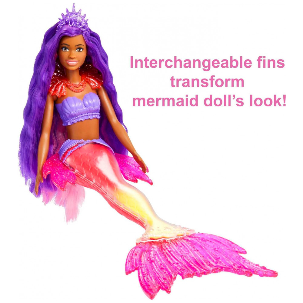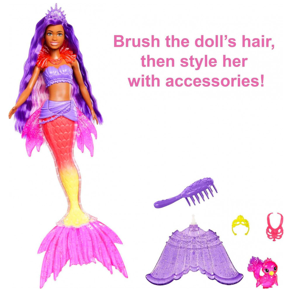 Com barbatanas intercambiáveis, 2 tiaras incrustadas de joias, 2 colares e uma escova de cabelo, as crianças podem mudar o visual da boneca Barbie para qualquer aventura.
