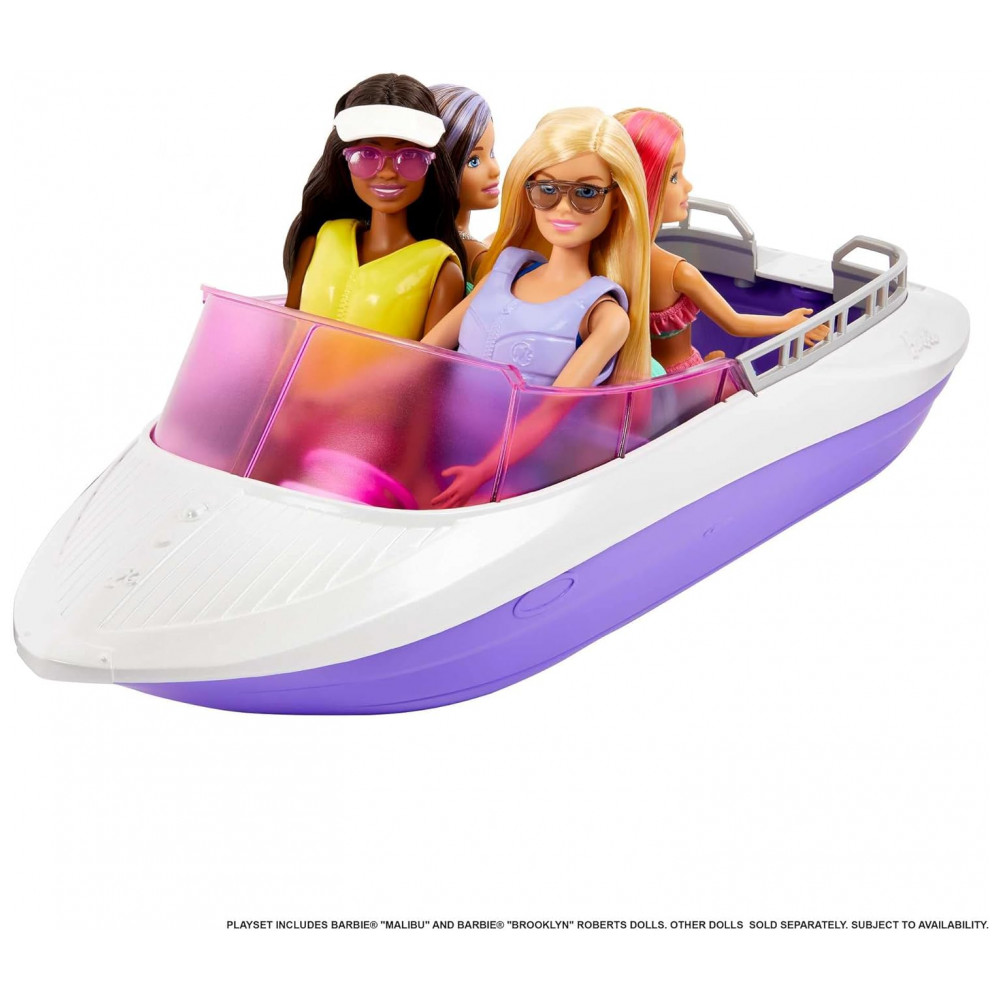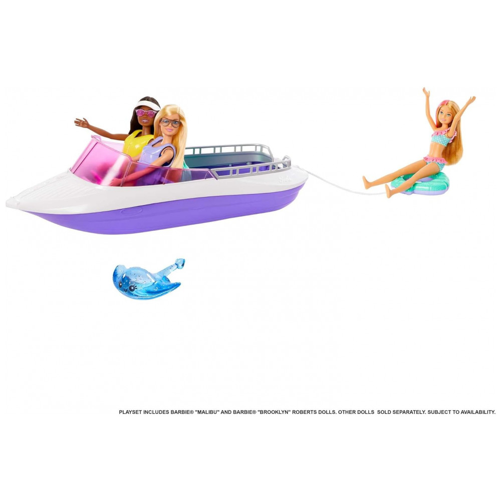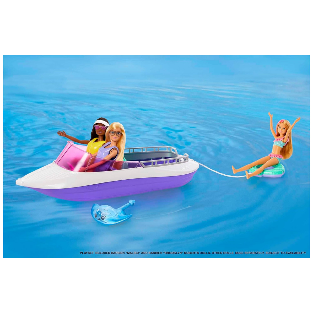 Inclui 1 barco com bote, 2 bonecas Barbie, 2 coletes salva vidas, 2 pares de óculos de sol, 1 câmera, 1 viseira e 1 protetor solar