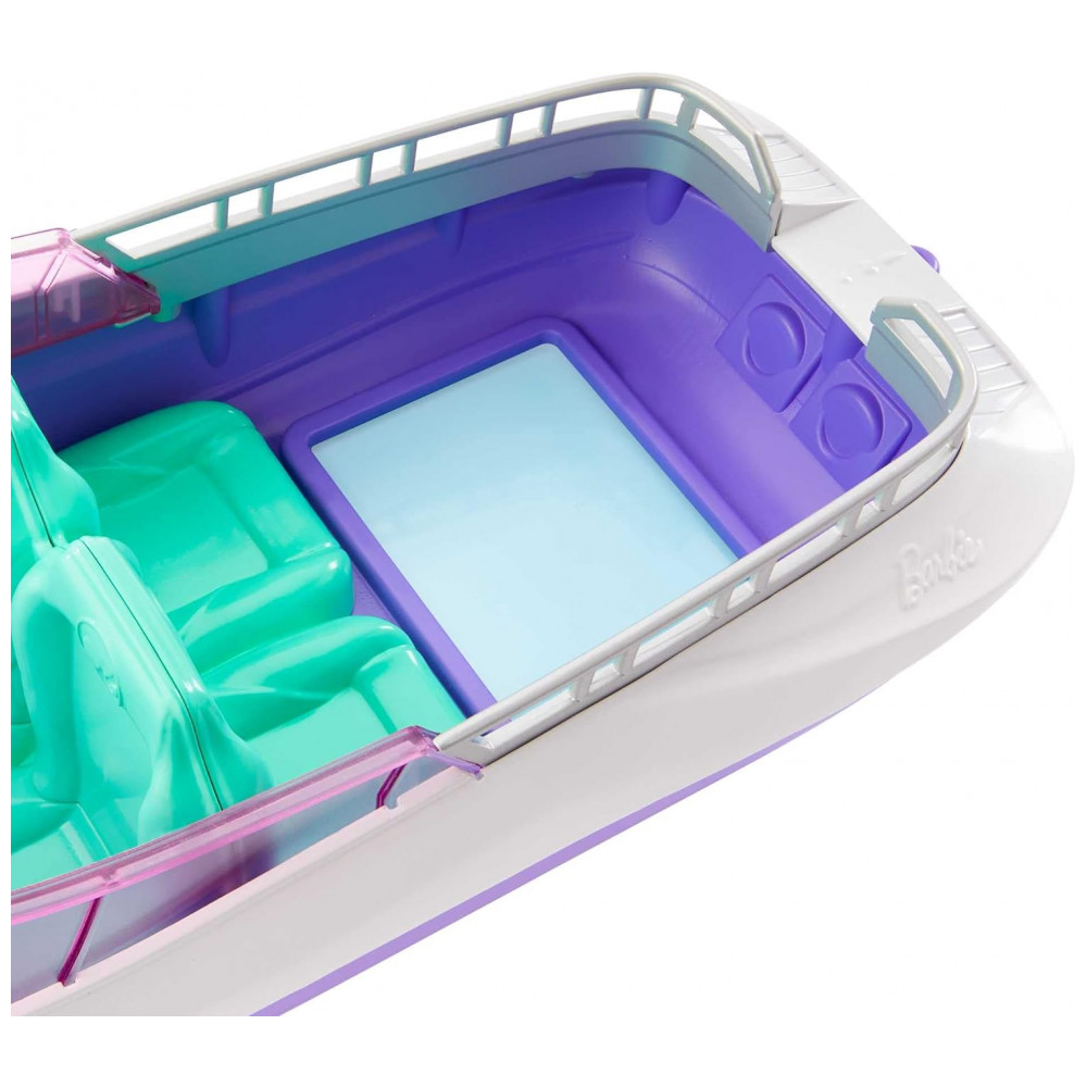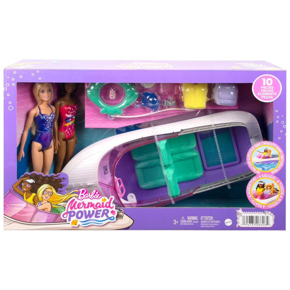 Inspirada na Barbie Mermaid Power, a lancha de 18 polegadas apresenta um design elegante e capacidade para 4 bonecas.