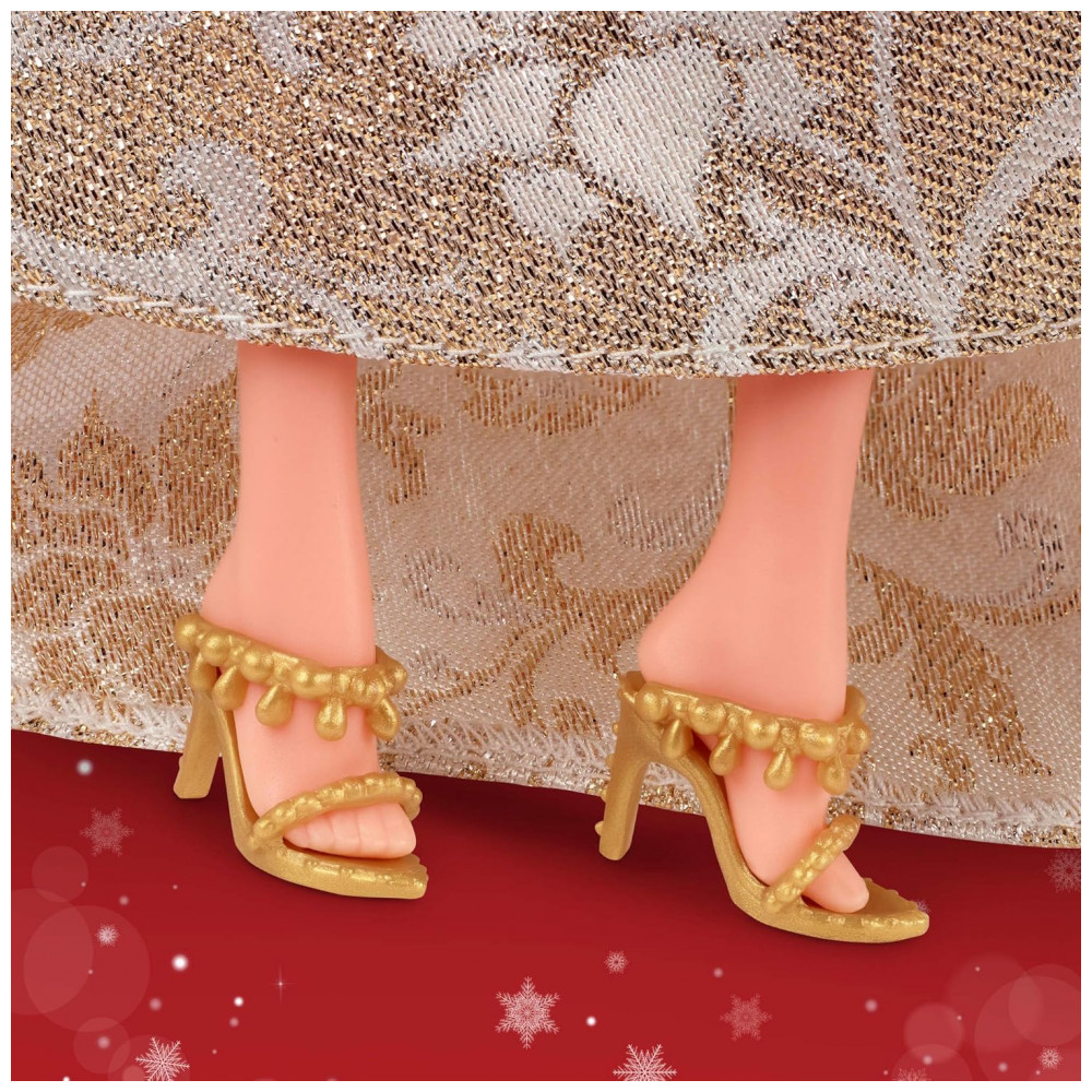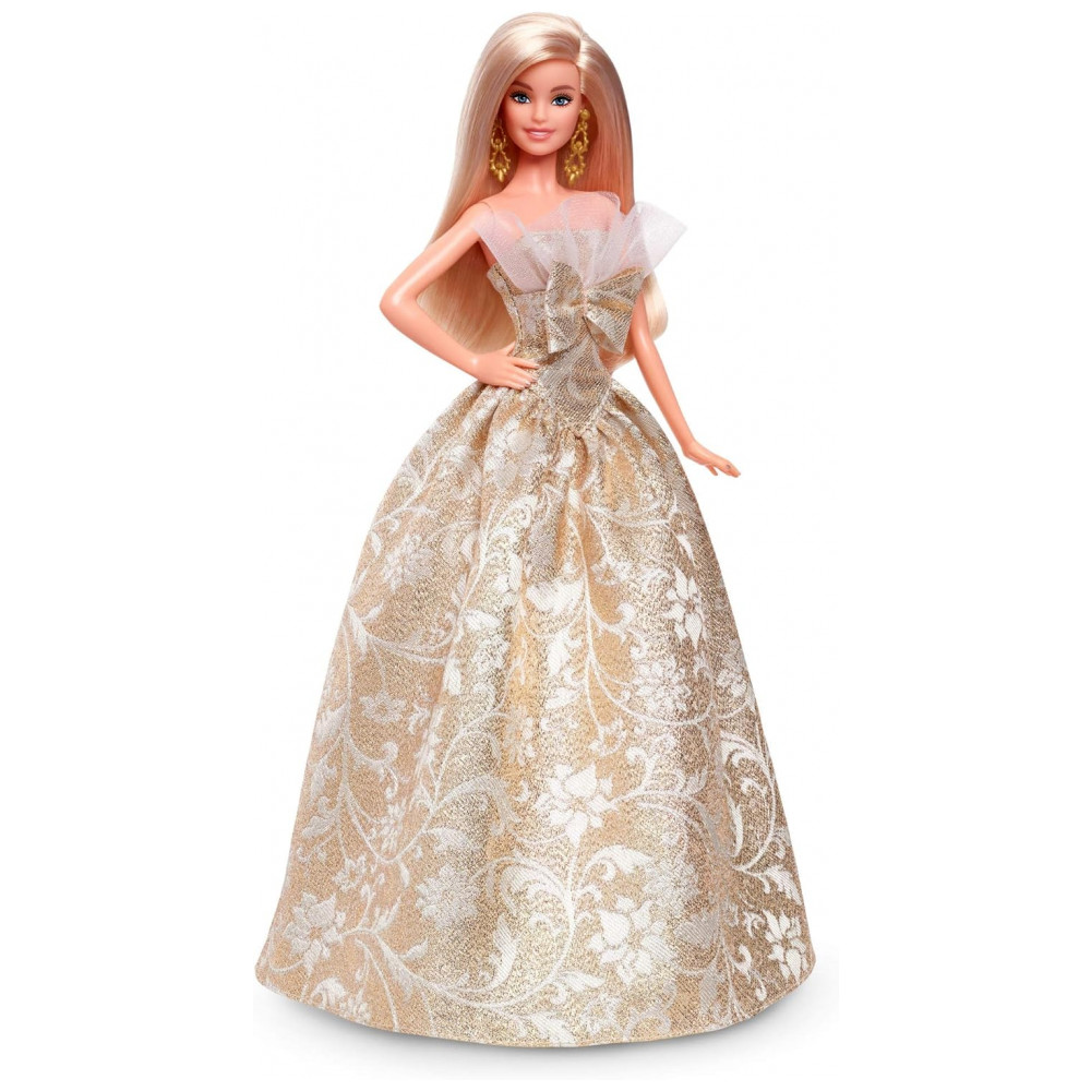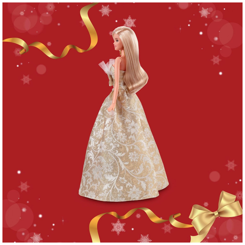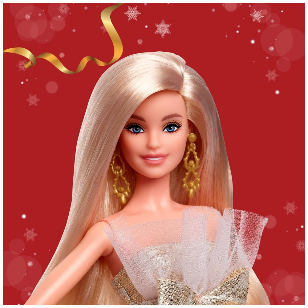 Conteúdo da embalagem: 1 boneca Barbie Signature 2025 Holiday loira com vestido, brincos e sapatos, 1 base para boneca, 1 certificado de autenticidade