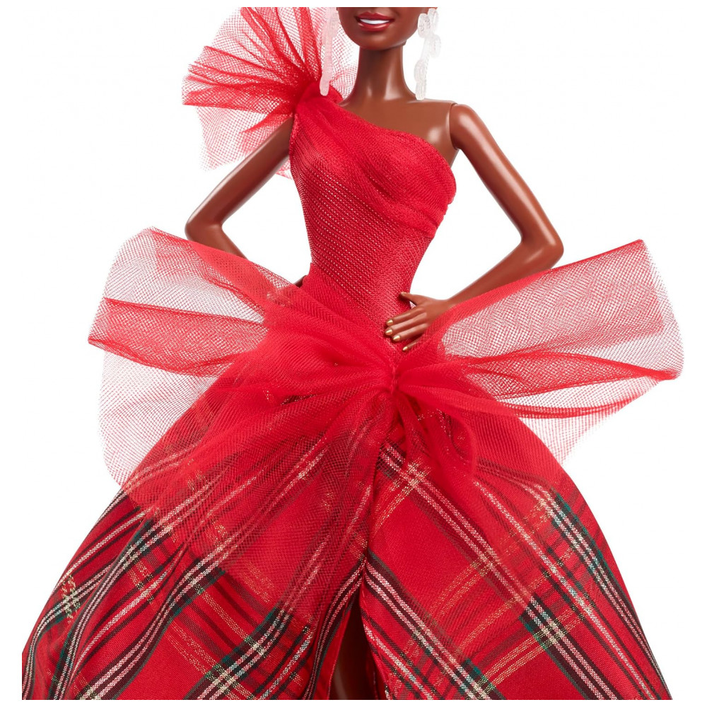 A Barbie Signature Holiday 2024 foi desenvolvida como edição colecionável de fim de ano, com foco em um visual festivo que combina corpete vermelho brilhante e saia ampla xadrez para exposição em base expositora. O modelo representa a personagem com estética de festa de inverno, unindo elementos clássicos de gala a detalhes contemporâneos como fenda na saia e volumes de tule.