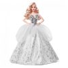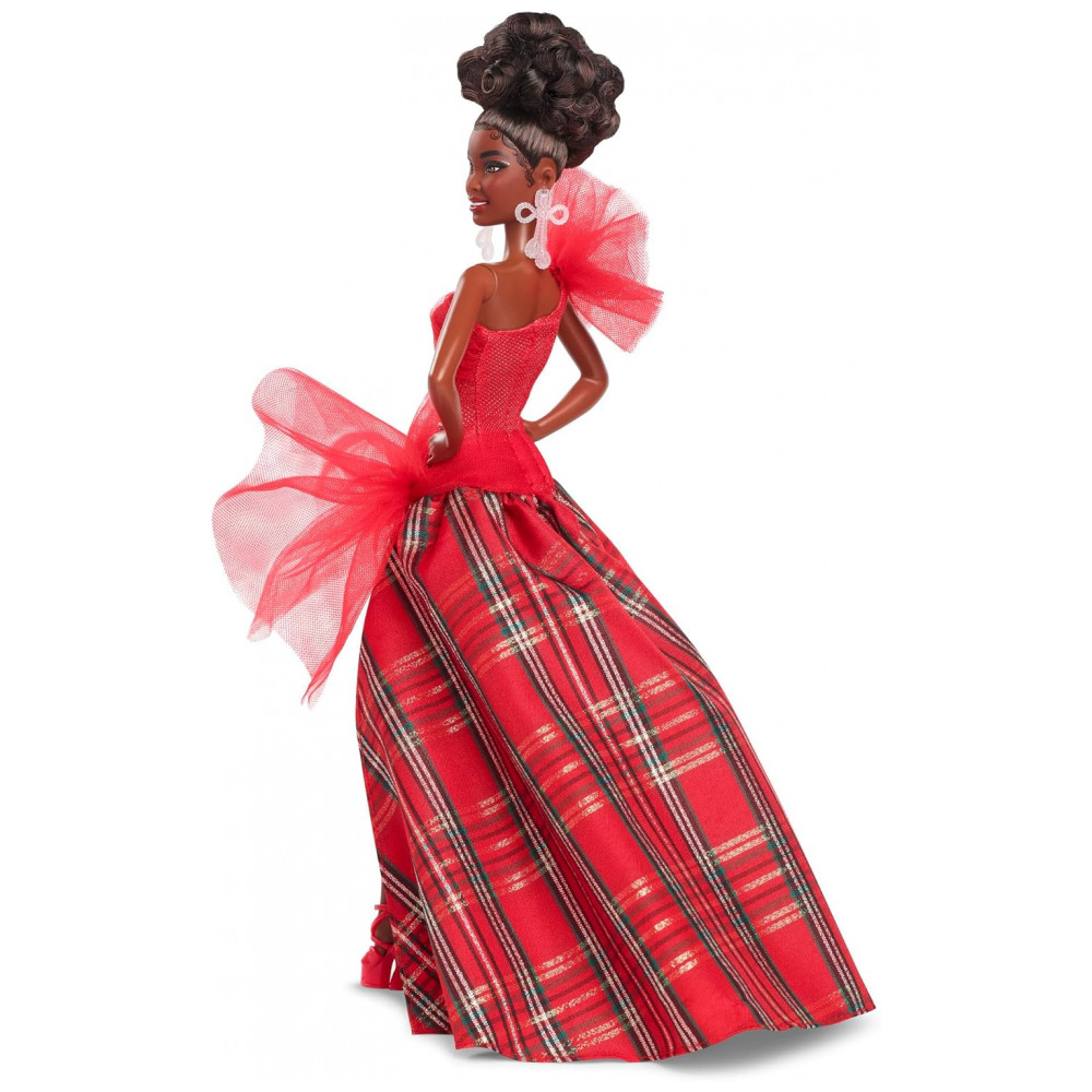 Esta versão traz a boneca com cabelo castanho cacheado preso em um coque alto, enfatizando o rosto e os acessórios de orelha. A peça é indicada para maiores de 6 anos, mas foi pensada principalmente para colecionadores que acompanham a série anual Holiday e buscam uma boneca temática da temporada. A embalagem é do tipo expositiva, com janela frontal ampla e design gráfico sazonal, ideal para presente e para exibição sem remoção da boneca.