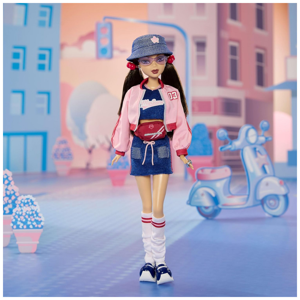 Boneca Barbie Signature My Scene Nolee colecionável look Y2K conjunto azul jaqueta rosa touca bucket leg warmers e base 2025