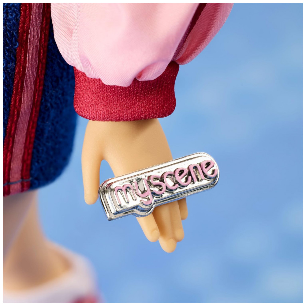 Os acessórios incluem chapéu bucket jeans, óculos escuros, pochete, perneiras (leg warmers) e sandálias jelly, compondo um look inspirado em passeios de skate e idas ao shopping. A boneca vem em embalagem expositora e inclui base para exibição, voltada a fãs de My Scene e colecionadores a partir de 6 anos.