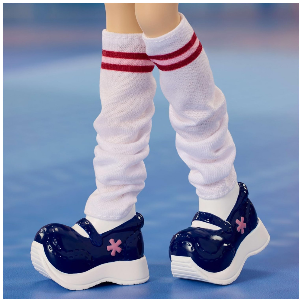 A Barbie Signature My Scene Nolee presta tributo às bonecas My Scene em uma edição colecionável com visual Y2K esportivo e glam. A personagem usa conjunto azul em tecido tipo toalha (terrycloth) com peças combinando, sobreposto por jaqueta cropped rosa candy. O cabelo é preso em maria‑chiquinhas com prendedores vermelhos em formato de bolinhas, mantendo o rosto no sculpt original da Nolee.