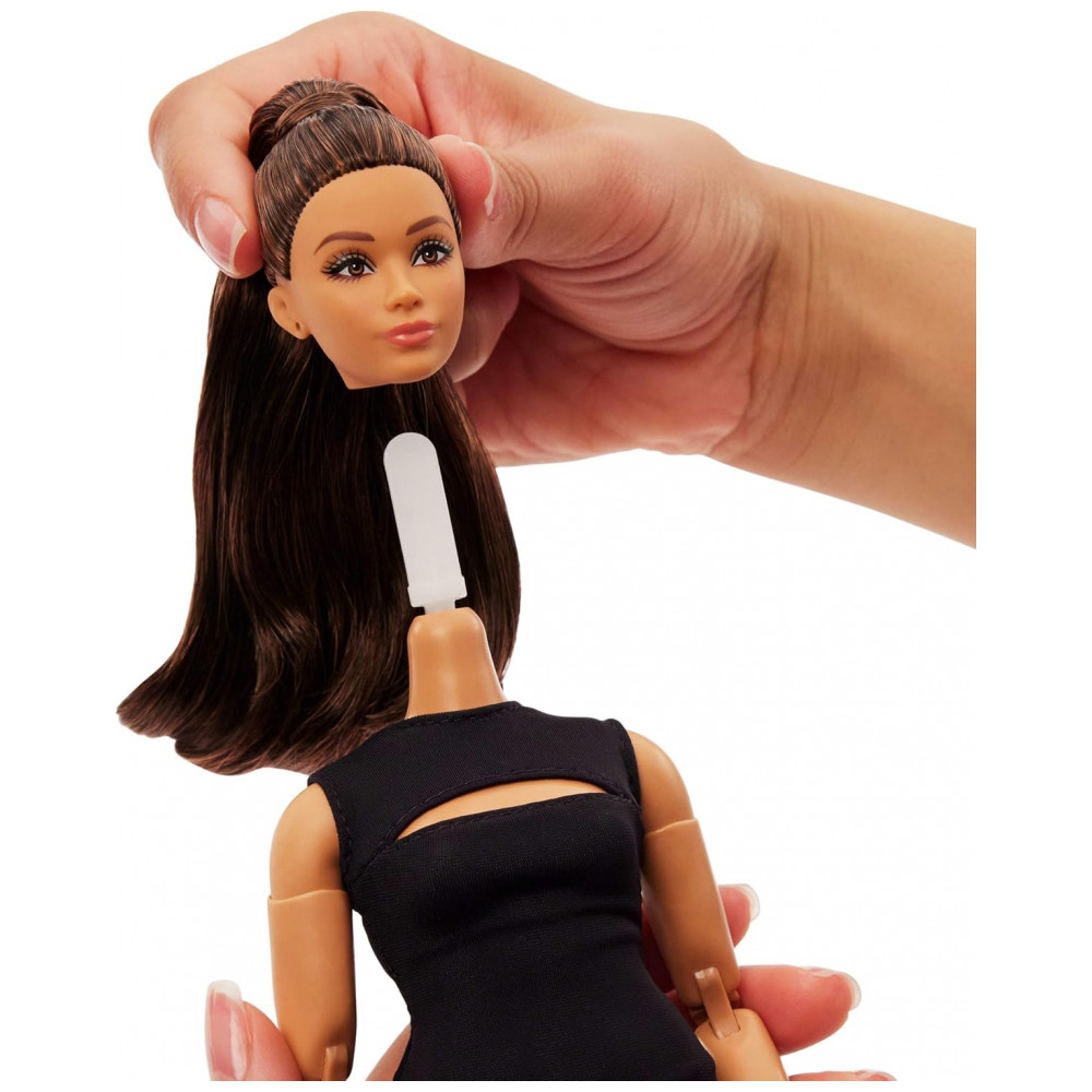A boneca utiliza corpo Made to Move curvy, com múltiplos pontos de articulação que possibilitam grande variedade de poses em braços, pernas, joelhos, tornozelos, quadris e tronco. Um conector especial de cabeça permite a substituição por outras cabeças compatíveis da linha You Create Barbie Basics, ampliando as opções de customização para colecionadores. O produto é recomendado para maiores de 6 anos e direcionado a fãs de moda, fotografia de bonecas e personalização de coleções.