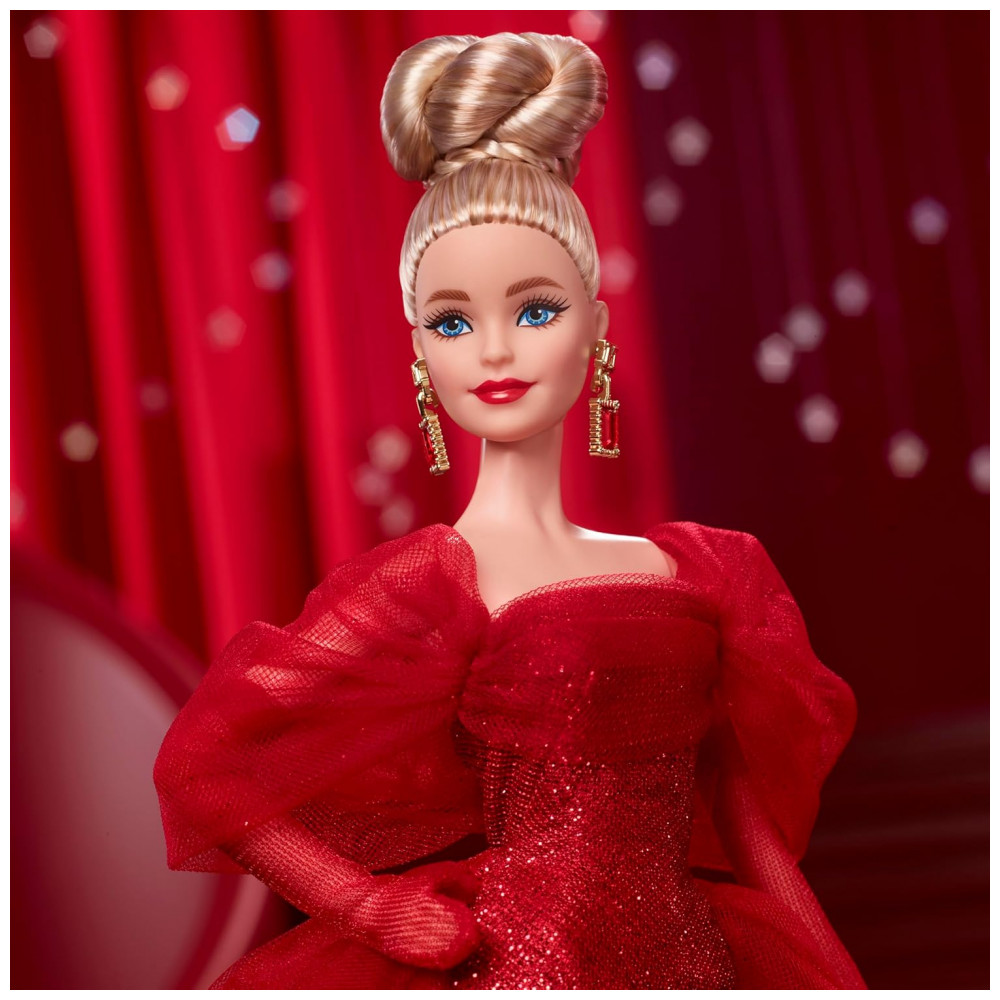 Esta boneca colecionável Barbie Signature celebra os 80 anos da Mattel em uma proposta de exibição sofisticada, com foco em acabamento detalhado e visual de gala. A peça apresenta vestido longo em tule vermelho com brilho, mangas em laço volumoso e cauda com sobreposição em tule, compondo um visual de tapete vermelho para vitrines e prateleiras de colecionadores.