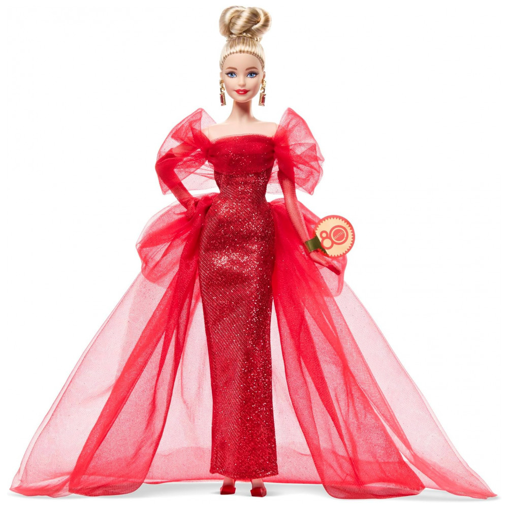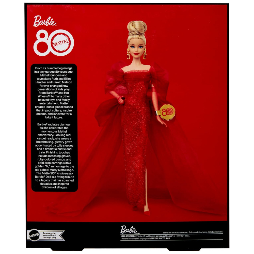 Conteúdo da caixa: 1 boneca Barbie Mattel 80 Anos, 1 vestido em tule vermelho, 1 par de brincos, 1 par de luvas, 1 par de sapatos, 1 certificado de autenticidade e 1 base expositora