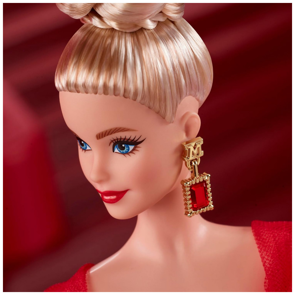 O traje inclui vestido em camadas de tule com efeito brilhante, busto ajustado e estrutura que realça o volume na parte de trás, criando uma silhueta dramática para exposição em bases e suportes. Os acessórios incorporam brincos tipo gota com detalhe em dourado em forma de “M”, referência ao logo clássico Matty Mattel, além de luvas translúcidas que deixam à mostra unhas esmaltadas em tom escuro. A boneca calça sapatos em tom rubi que complementam o conjunto, reforçando o visual monocromático em vermelho para uma apresentação uniforme.