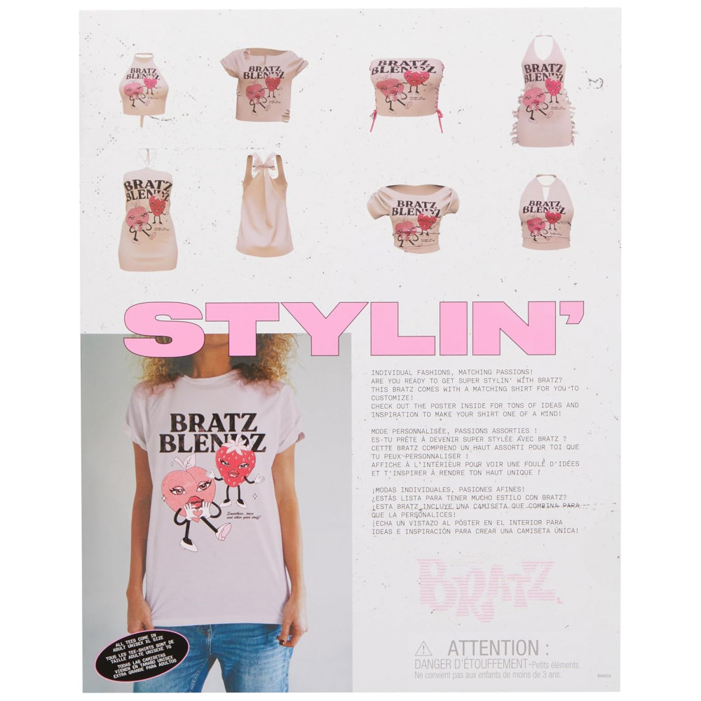 As Bratz estão de volta com novos looks ESTILOSOS, mas desta vez querem compartilhar sua paixão pela moda com você! Esta boneca Bratz vem com uma camiseta combinando para você personalizar. Moda individual, paixões combinadas! Cloe personalizou sua camiseta gráfica cortando-a e criando um decote ombro a ombro. Combinada com calças jeans e salto alto, uma bolsa combinando, óculos de sol e acessórios. Seu cabelo está em rabos de cavalo altos, e seu visual é glamouroso com um batom rosa. COMPARTILHANDO A MODA Vem com uma camiseta gráfica para você vestir! ESTILO SUA CAMISETA Recorte, corte e faça dela suaessa camiseta gráfica exclusiva em tamanho grande é feita para combinar com seu estilo e com suas bonecas! ACESSORIZE Acessórios combinando para aprimorar o visual. INCLUI 1 Boneca Bratz Stylin, 1 camiseta, 1 calça jeans, 1 bolsa, 1 par de óculos e 1 escova, além de uma camiseta gráfica adulta XL para você personalizar e combinar com sua boneca!