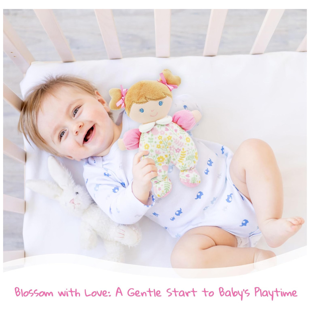 A Boneca de Pelúcia Blossom da June Garden é a companheira perfeita para bebês! Extremamente macia e fofinha, é ideal para abraçar e brincar no berçário, sendo a primeira boneca perfeita para recém-nascidos e bebês. Possui um chocalho interativo que estimula os sentidos e a curiosidade do bebê durante a brincadeira. Com detalhes bordados no rosto, cabelos castanhos com laços de cetim e uma encantadora roupa de pijama floral, esta boneca é irresistivelmente fofa. Feita com materiais seguros para bebês e adequada desde o nascimento, garantindo ser uma amiga segura e reconfortante para o seu pequeno. Além disso, é uma opção de presente de chá de bebê muito atenciosa e encantadora para novos pais, perfeita para chás de bebê ou para dar as boas-vindas a um novo membro na família.