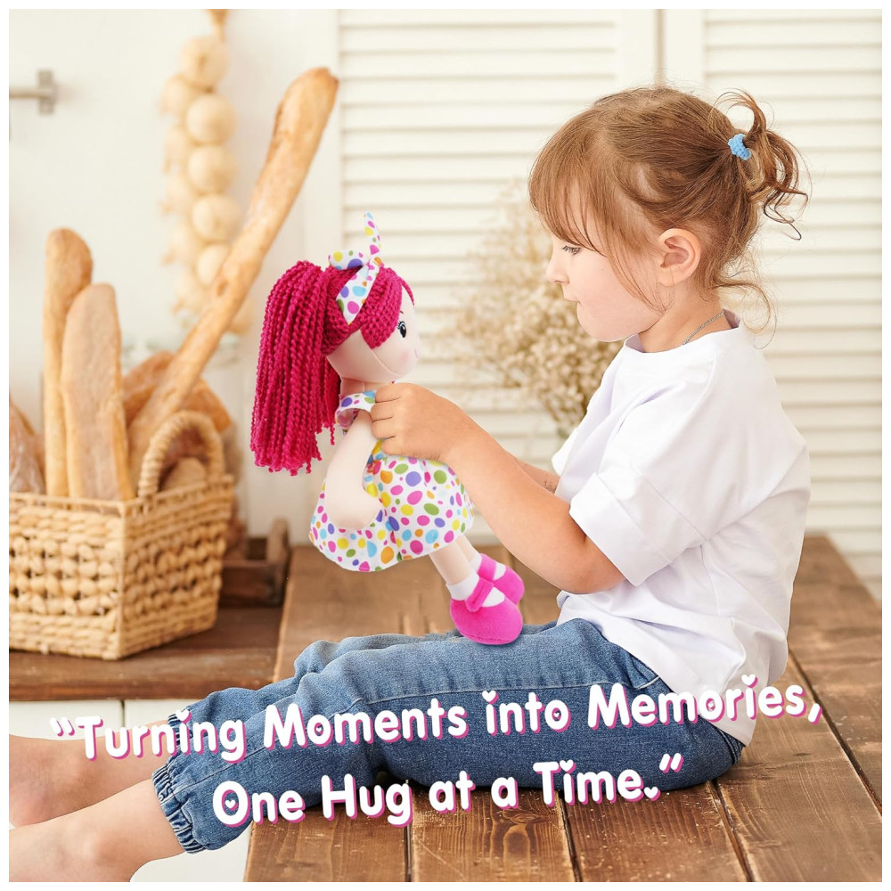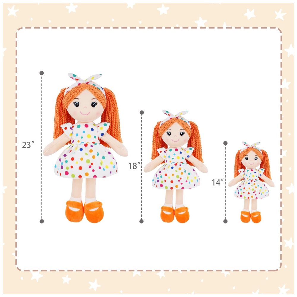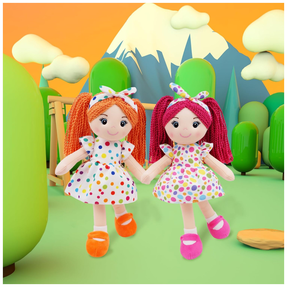 A Bella possui um rosto lindamente bordado com um sorriso caloroso, ideal para ser a companheira amorosa de uma criança. Com detalhes cativantes, como cabelos cacheados laranja e uma faixa de cabelo branca com bolinhas, a Bella está vestida com um vestido branco vibrante com estampa colorida de bolinhas. Recheada com materiais macios e sustentáveis, a Coleção Snuggle Cuties da June Garden demonstra nosso compromisso com a proteção ambiental. Com dimensões de 46 x 24 x 9 centímetros, a Bella é do tamanho perfeito para mãos pequenas segurarem, abraçarem e acariciarem. Adequada para crianças a partir de 1 ano, a Bella promete ser um presente emocionante e uma companheira aconchegante para todas as meninas.