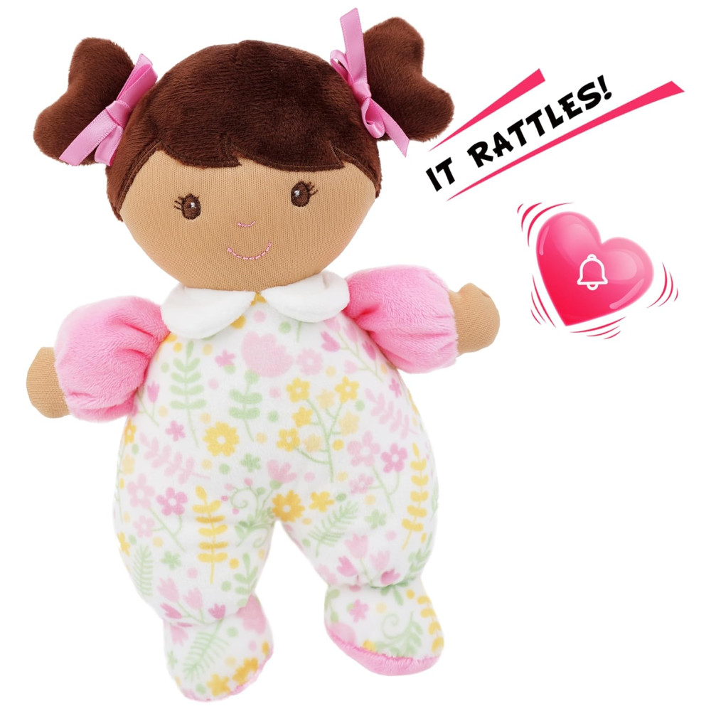 Acompanhante Perfeito para o Primeiro Contato, macio e fofinho, ideal para abraçar e brincar no berçário, tornando-se a primeira boneca perfeita para recém-nascidos e bebês. Possui um chocalho interativo com som suave, estimulando os sentidos e despertando a curiosidade do bebê durante o tempo de brincadeira. Com detalhes faciais bordados, cabelos castanhos com laços de cetim e um charmoso conjunto de pijama floral, esta boneca é irresistivelmente fofa. Feita com materiais seguros para bebês e adequada desde o nascimento, garantindo ser uma amiga segura e reconfortante para o seu pequeno. Uma opção de presente atenciosa e encantadora para novos pais, perfeita para chás de bebê ou para dar boas-vindas a um novo membro da família.