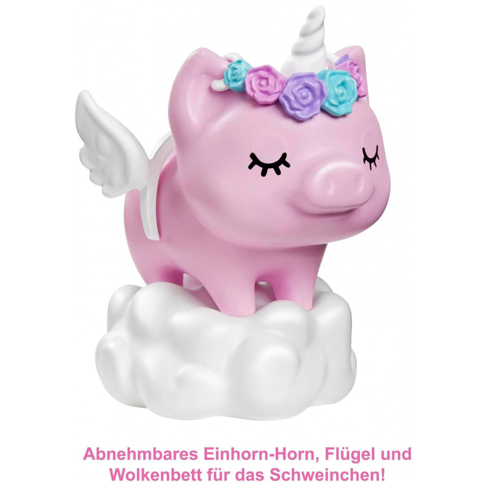 A figura do porco de estimação também é muito EXTRA, com um chifre e asas de unicórnio removíveis, cama de nuvens e expressão lúdica