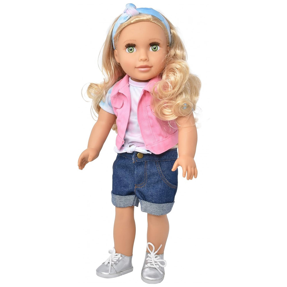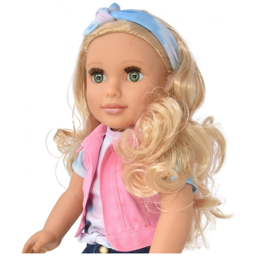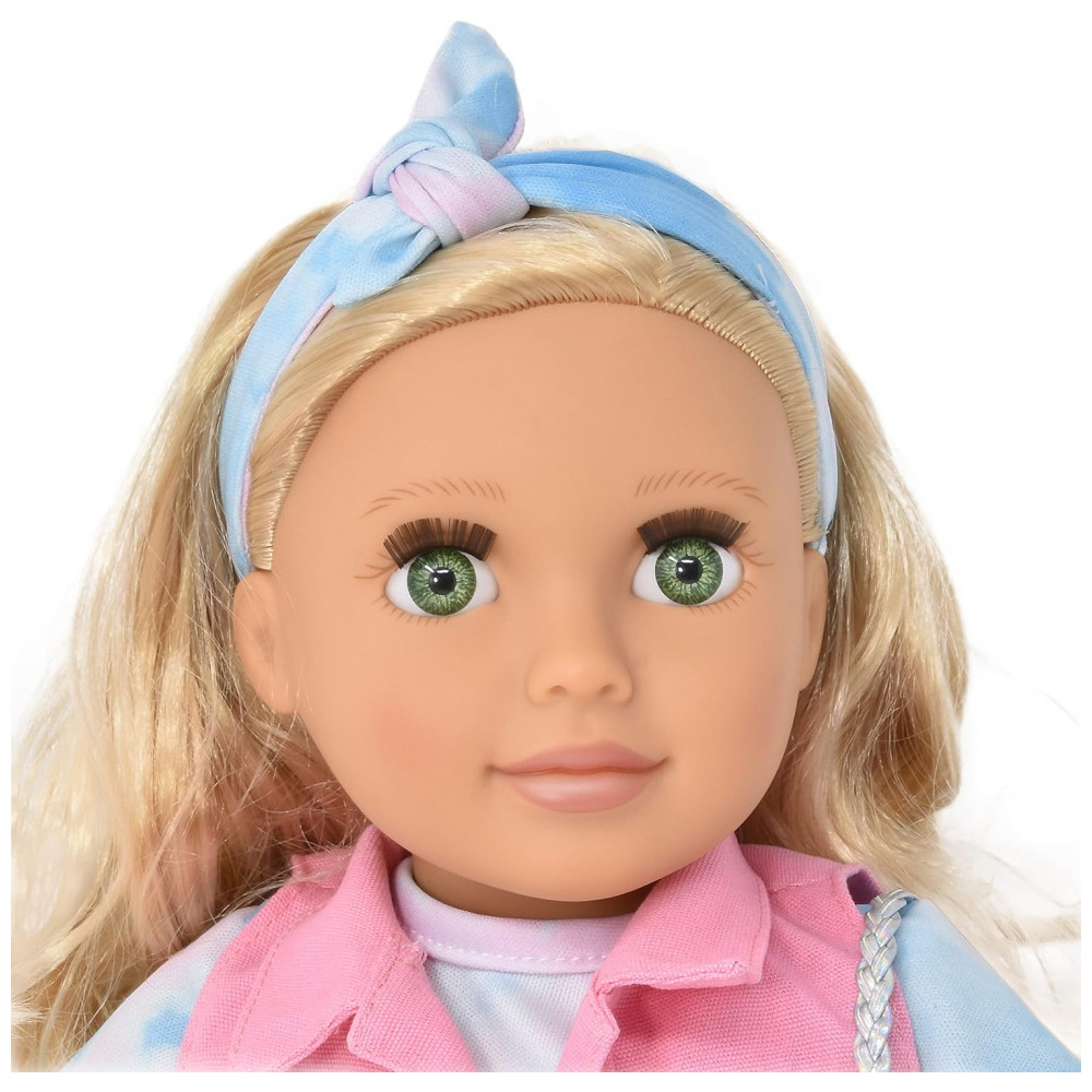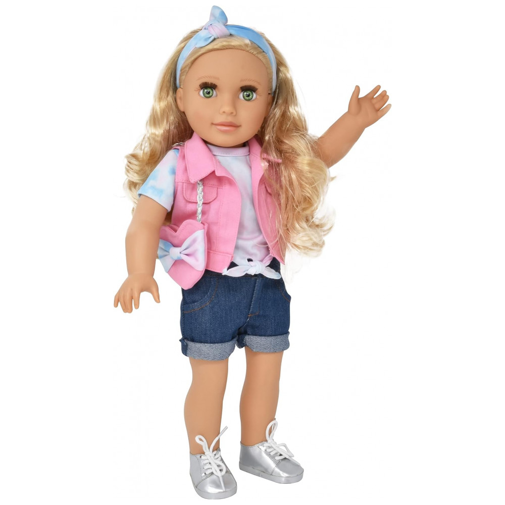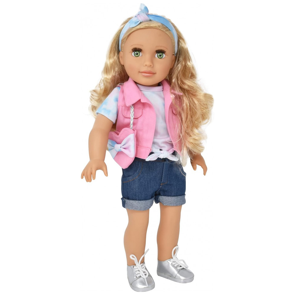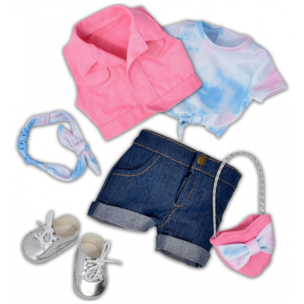 Roupas e Acessórios Jaqueta rosa, camiseta tie dye com faixa de cabelo combinando, calça jeans, tênis prata e bolsa combinando. As roupas podem ser facilmente trocadas, ajudando a desenvolver habilidades motoras finas.