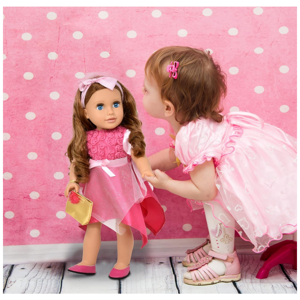Roupas e Acessórios Vestido princesa rosa rosa com sapato e laço de cabelo combinando, e bolsa dourada.