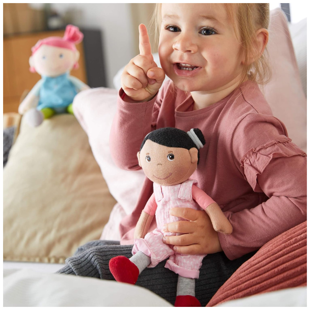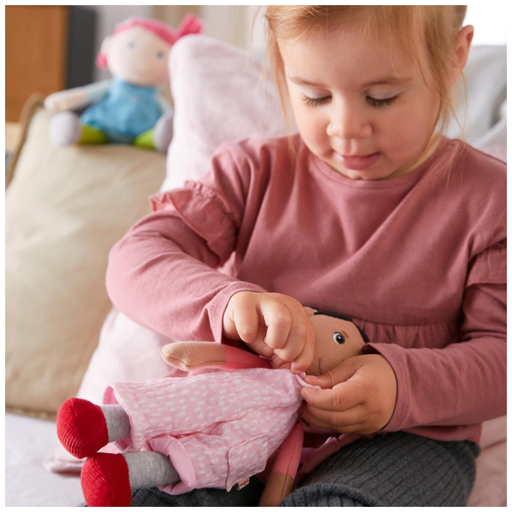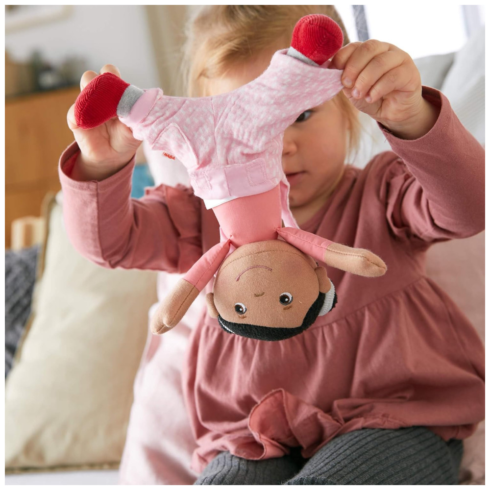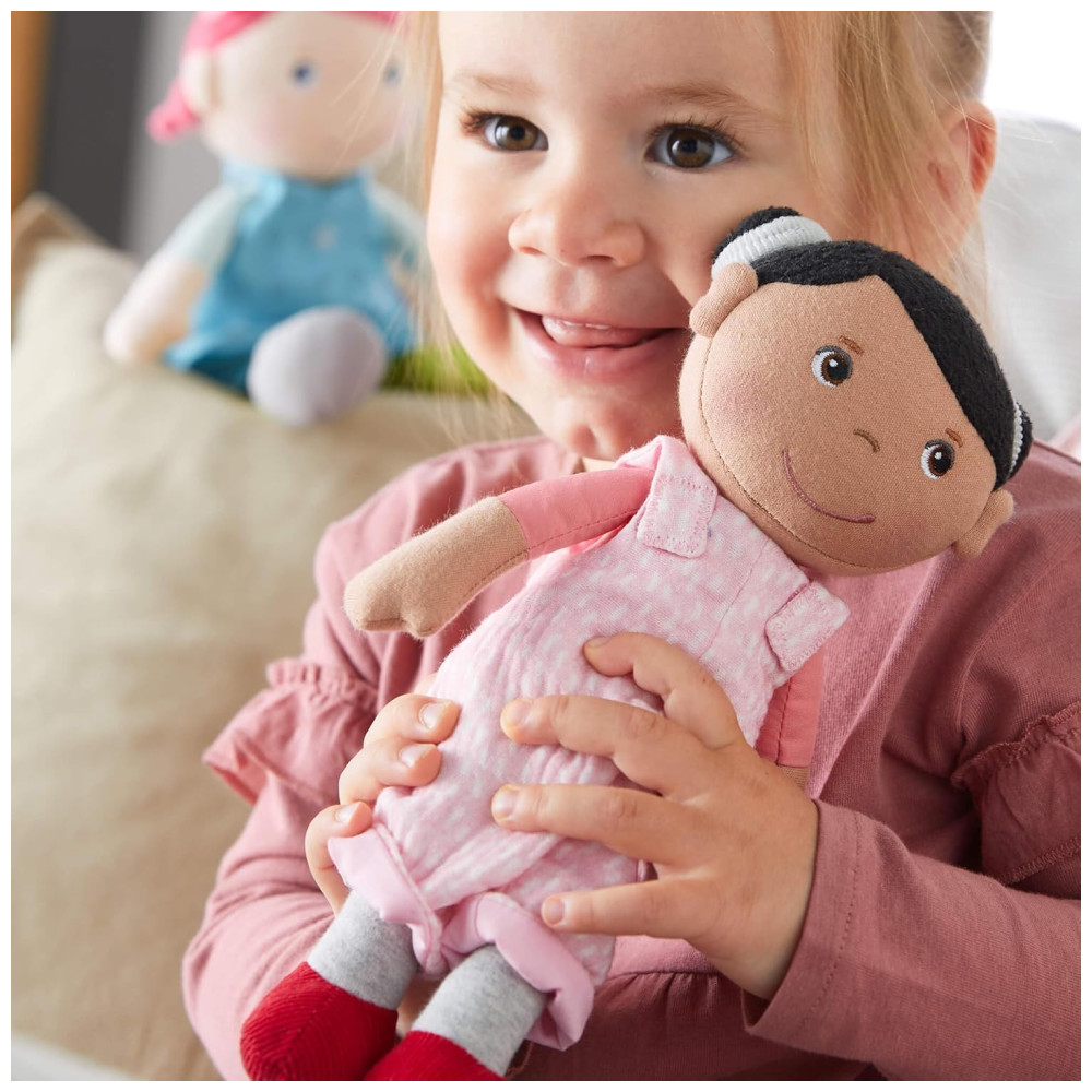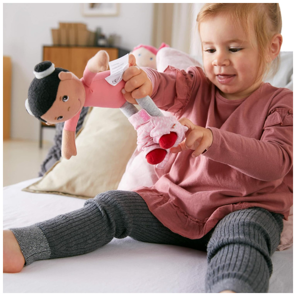 Boneca HABA Snug Up Doll Rumbi com Cabelos Pretos e Jardineira Rosa – Lavável à Máquina para 18 Meses e Acima